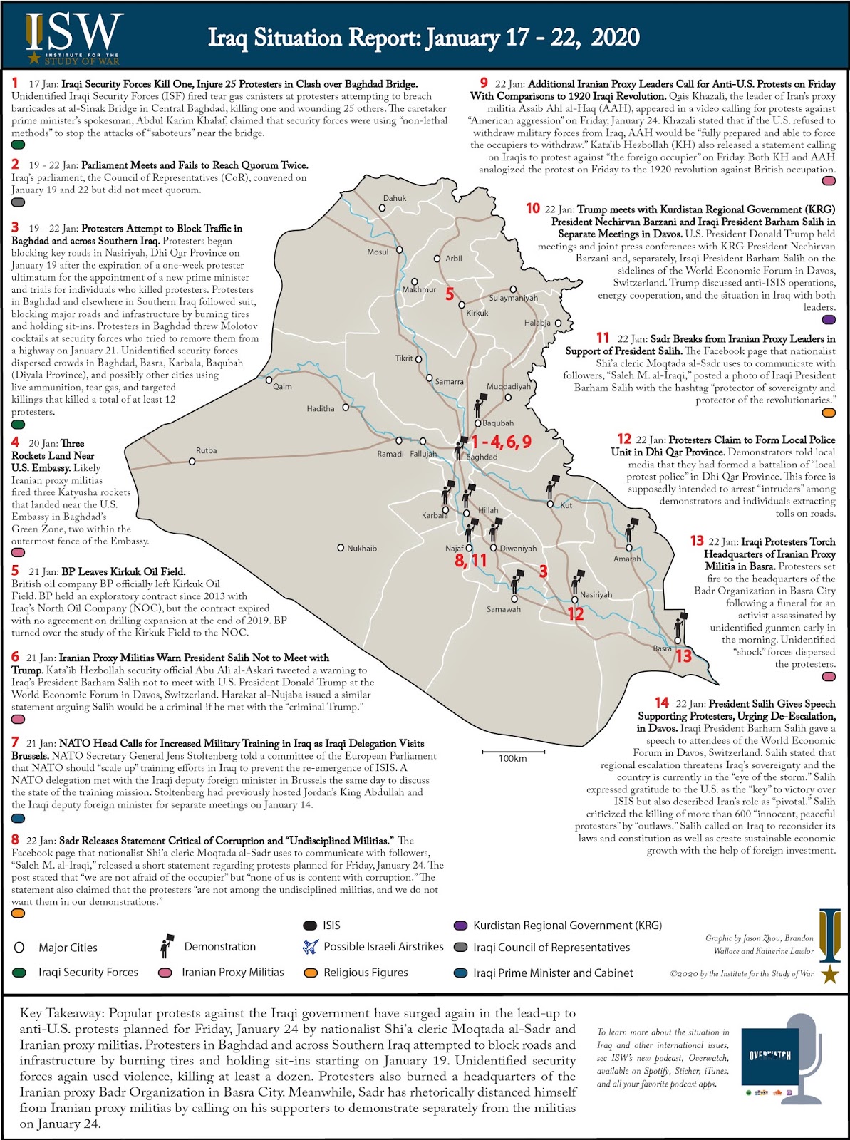 : Popular protests against the Iraqi government have surged again in the lead-up to anti-U.S. protests planned for Friday, January 24 by nationalist Shi’a cleric Moqtada al-Sadr and Iranian proxy militias. Protesters in Baghdad and across Southern Iraq attempted to block roads and infrastructure by burning tires and holding sit-ins starting on January 19. Unidentified security forces again used violence, killing at least a dozen. Protesters also burned a headquarters of the Iranian proxy Badr Organization in Basra City. Meanwhile, Sadr has rhetorically distanced himself from Iranian proxy militias by calling on his supporters to demonstrate separately from the militias on January 24.