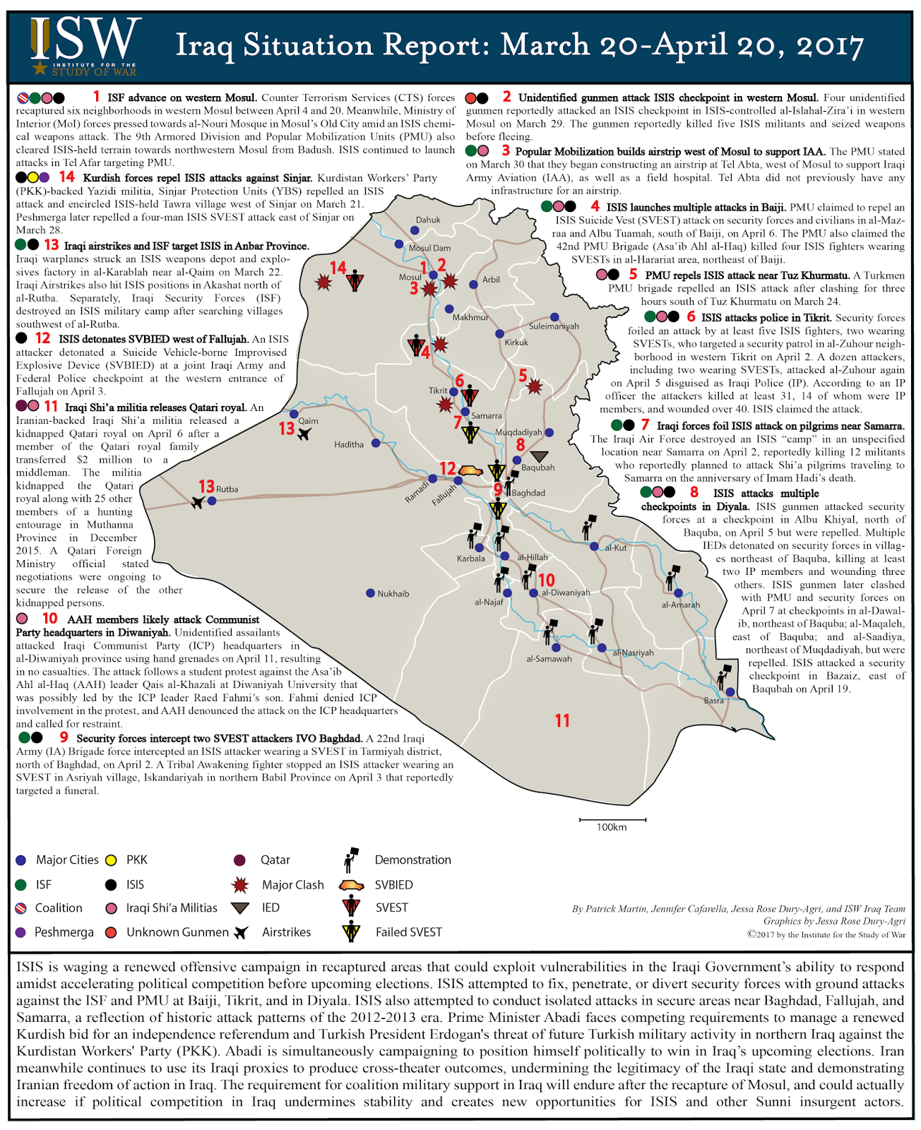 ISIS is waging a renewed offensive campaign in recaptured areas that could exploit vulnerabilities in the Iraqi Government’s ability to respond amidst accelerating political competition before upcoming elections. ISIS attempted to fix, penetrate, or divert security forces with ground attacks against the ISF and PMU at Baiji, Tikrit, and in Diyala. ISIS also attempted to conduct isolated attacks in secure areas near Baghdad, Fallujah, and Samarra, a reflection of historic attack patterns of the 2012-2013 era. Prime Minister Abadi faces competing requirements to manage a renewed Kurdish bid for an independence referendum and Turkish President Erdogan’s threat of future Turkish military activity in northern Iraq against the Kurdistan Workers’ Party (PKK). Abadi is simultaneously campaigning to position himself politically to win in Iraq’s upcoming elections. Iran meanwhile continues to use its Iraqi proxies to produce cross-theater outcomes, undermining the legitimacy of the Iraqi state and demonstrating Iranian freedom of action in Iraq. The requirement for coalition military support in Iraq will endure after the recapture of Mosul, and could actually increase if political competition in Iraq undermines stability and creates new opportunities for ISIS and other Sunni insurgent actors.