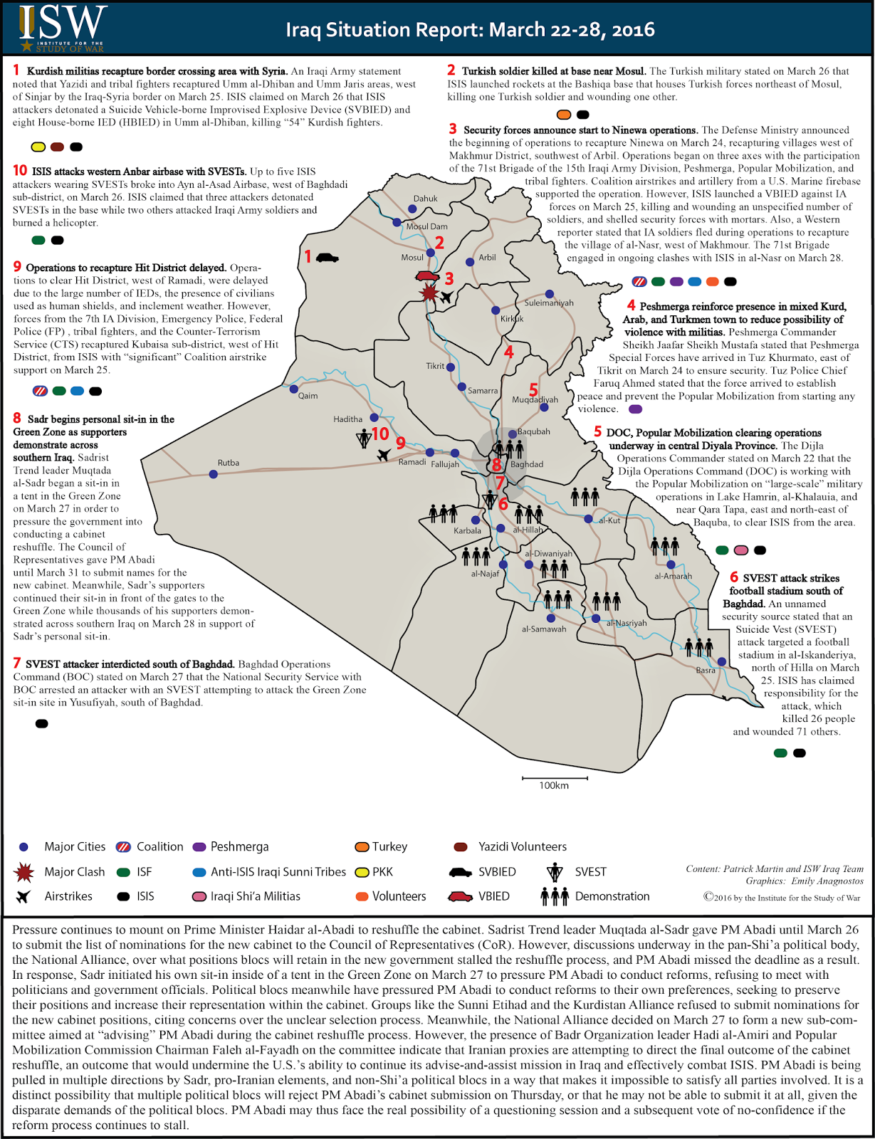 Key Take-Away: Pressure continues to mount on Prime Minister Haidar al-Abadi to reshuffle the cabinet. Sadrist Trend leader Muqtada al-Sadr gave PM Abadi until March 26 to submit the list of nominations for the new cabinet to the Council of Representatives (CoR). However, discussions underway in the pan-Shi’a political body, the National Alliance, over what positions blocs will retain in the new government stalled the reshuffle process, and PM Abadi missed the deadline as a result. In response, Sadr initiated his own sit-in inside of a tent in the Green Zone on March 27 to pressure PM Abadi to conduct reforms, refusing to meet with politicians and government officials. Political blocs meanwhile have pressured PM Abadi to conduct reforms to their own preferences, seeking to preserve their positions and increase their representation within the cabinet. Groups like the Sunni Etihad and the Kurdistan Alliance refused to submit nominations for the new cabinet positions, citing concerns over the unclear selection process. Meanwhile, the National Alliance decided on March 27 to form a new sub-committee aimed at “advising” PM Abadi during the cabinet reshuffle process. However, the presence of Badr Organization leader Hadi al-Amiri and Popular Mobilization Commission Chairman Faleh al-Fayadh on the committee indicate that Iranian proxies are attempting to direct the final outcome of the cabinet reshuffle, an outcome that would undermine the U.S.’s ability to continue its advise-and-assist mission in Iraq and effectively combat ISIS. PM Abadi is being pulled in multiple directions by Sadr, pro-Iranian elements, and non-Shi’a political blocs in a way that makes it impossible to satisfy all parties involved. It is a distinct possibility that multiple political blocs will reject PM Abadi’s cabinet submission on Thursday, or that he may not be able to submit it at all, given the disparate demands of the political blocs. PM Abadi may thus face the real possibility of a questioning session and a subsequent vote of no-confidence if the reform process continues to stall.