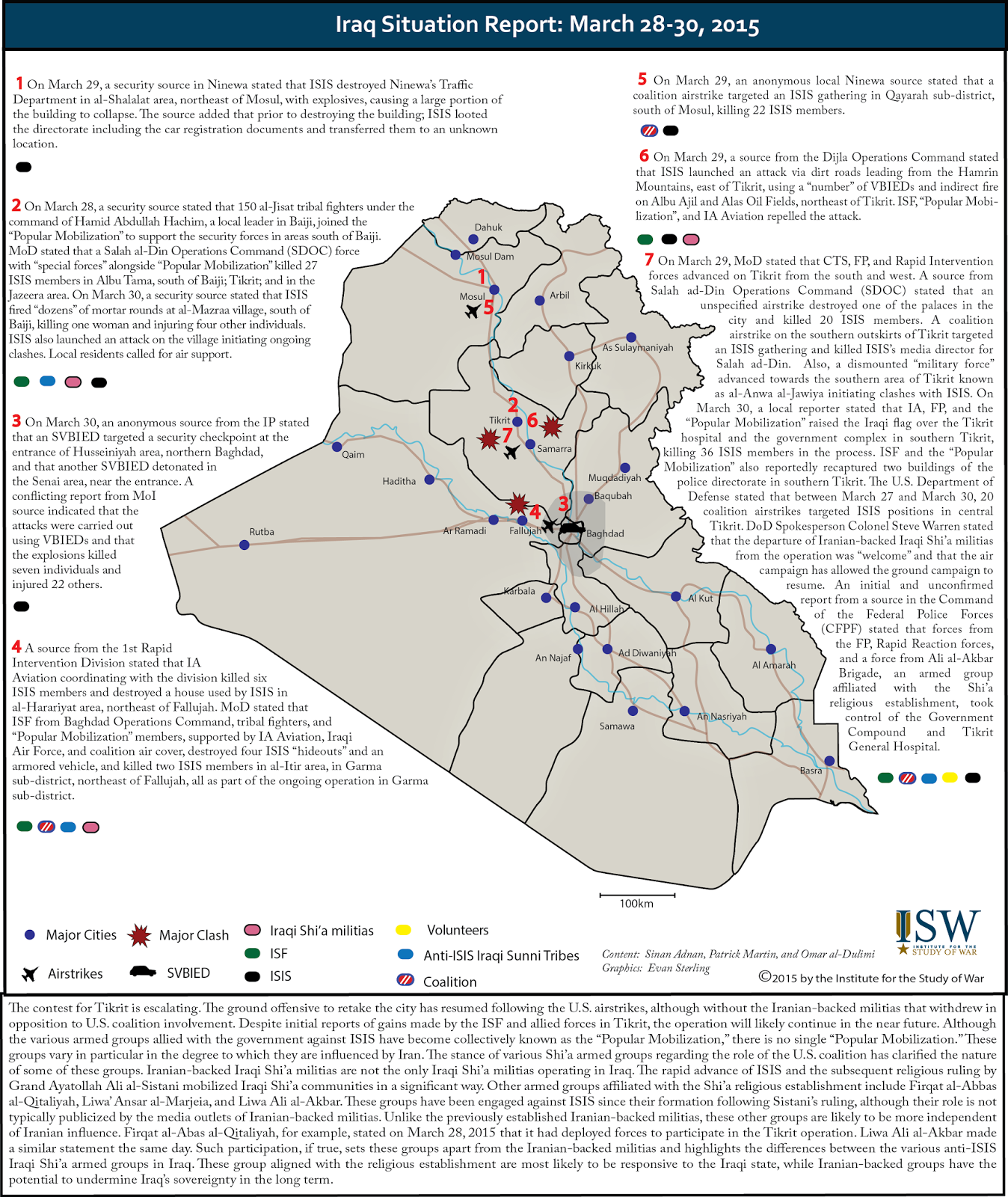 Previous Next Iraq Situation Report: March 28-30, 2015 by: Sinan Adnan, Patrick Martin, and Omar al-Dulimi Previous Next