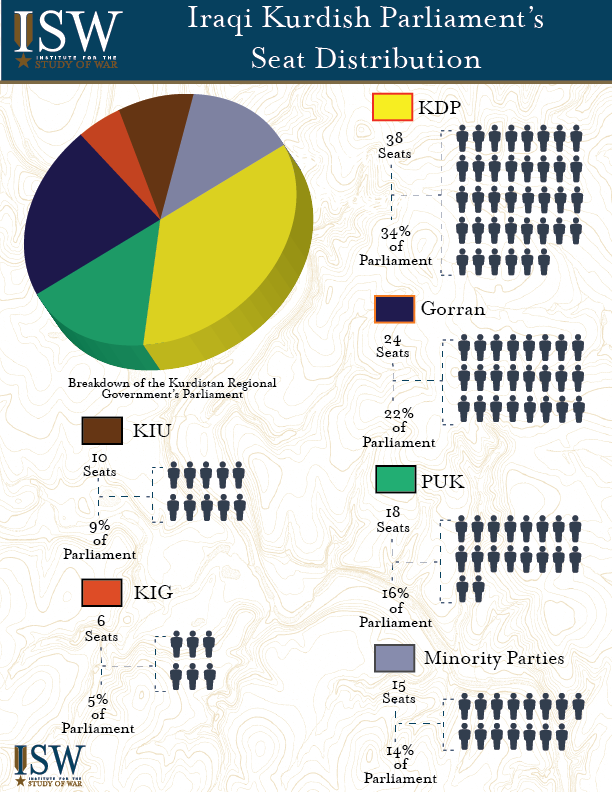 Key Takeaway: Iraq’s Kurdish political parties have fractured rapidly since September 2017, when the Kurdistan Regional Government (KRG) unilaterally held an independence referendum contravening ultimatums from Baghdad and Tehran. The KRG lost control of key terrain to Iraqi Security Forces and Iranian proxies in October 2017, forcing longtime KRG President Masoud Barzani, the architect of the referendum, to resign from his office. Further fractures in mid-January 2018 have set conditions for an even more contentious Kurdish legislative election in March 2018 that will determine Barzani’s successor and shape the KRG’s political structure. These fractures also reduce the ability of Kurdish parties to negotiate effectively with Baghdad over key issues for the region’s future, such as its share of Iraq’s national budget. The Kurdish electoral splits may endure long enough to preclude the Kurds from functioning as an effective, cohesive power bloc in the upcoming Iraqi national elections.