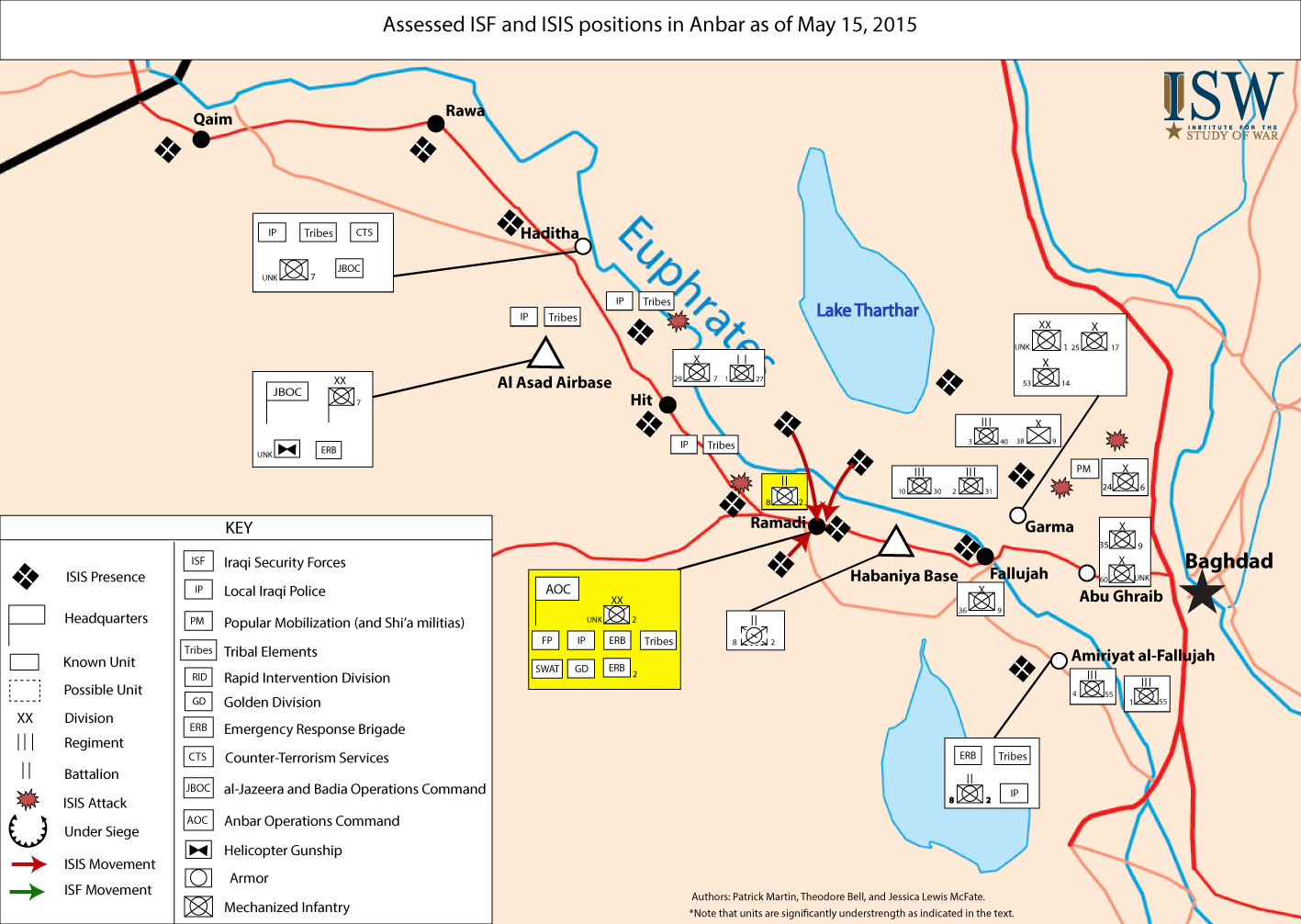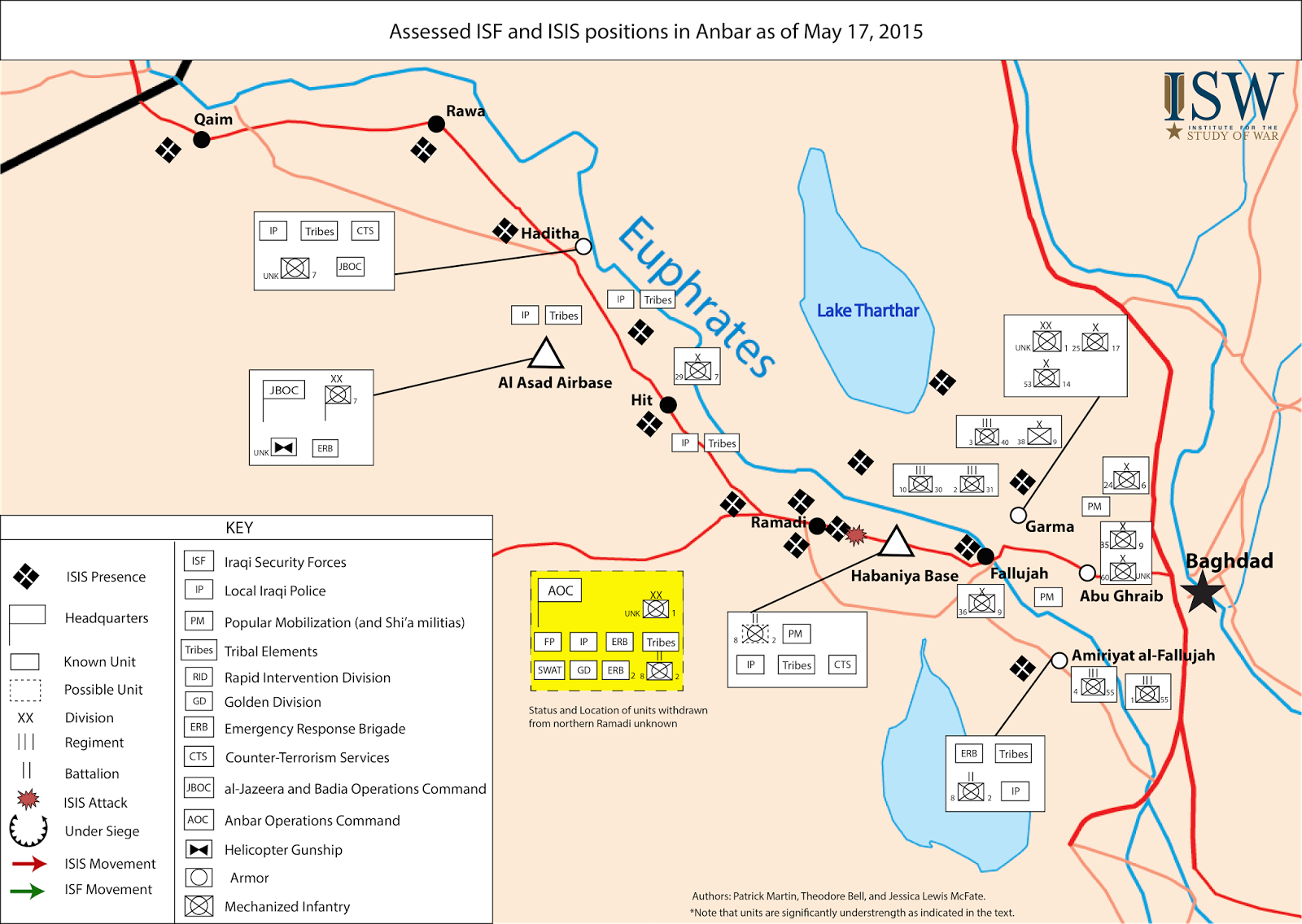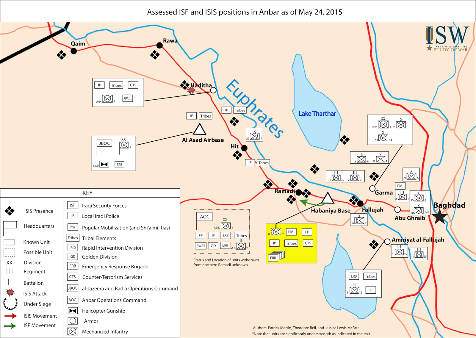 Key Takeaway: ISIS’s seizure of Ramadi city May 15-18 has altered disposition of the Iraqi Security Forces (ISF) in Anbar province and challenges the Iraqi government’s ability to mount successful counteroffensives. The two primary military positions remaining in Anbar after Ramadi’s fall are Habaniya, east of Ramadi and al-Asad airbase, west of Hit. As of May 27 “thousands” of Shi’a militia members continue to arrive at the Habaniya base following the Iraqi Prime Minister’s call for the Popular Mobilization Commission to prepare for operations in Anbar. In contrast, the ISF in al-Asad airbase are supplemented by Sunni tribal fighters undergoing training by U.S. personnel. It remains to be seen how the Iraqi government will integrate the efforts of its forces at al-Asad and Habaniya bases to mutually beneficial effect, especially in light of the U.S. presence at al-Asad and the Iranian-backed militias’ presence at Habaniya. On May 26 the Popular Mobilization Commission launched a joint operation with the ISF to recapture parts of Ramadi as well as northern and western Salah ad-Din. As of May 29 the ISF is contesting southern Ramadi and the ISF and the Popular Mobilization, including Iranian-backed Shi’a militias, have reported successes east of Fallujah, south of Samarra, and south of the Baiji Oil Refinery. The Iranian-backed Shi’a militias now play a prominent role in the province. These developments may also compromise the U.S. role in Anbar, a high risk given the presence of U.S. personnel at al-Asad airbase.