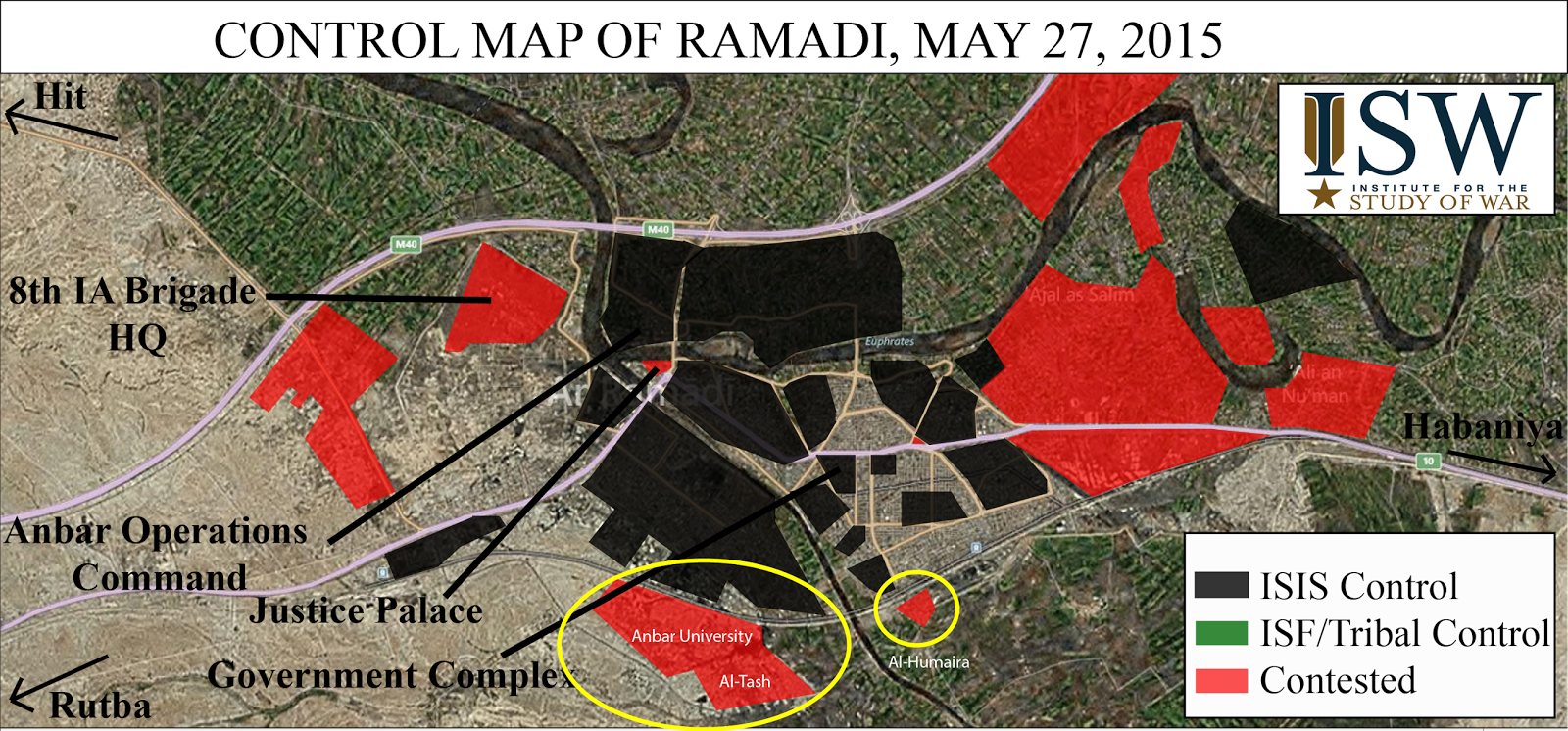 Over May 26-27 the ISF and “Popular Mobilization” forces launchedindirect fire on Ramadi city began contesting Anbar University and the al-Tash and Humeira areas south of Ramadi, clashing with ISIS fighters who detonated SVESTs. The elite Golden Division (GD) reportedly clashed with ISIS at Anbar University, killing seven ISIS members wearing SVESTs. The Anbar police chief stated that the ISF also launched operations to recapture Ta’mim, north of Anbar University and arrested “tens” of non-Iraqi ISIS members.