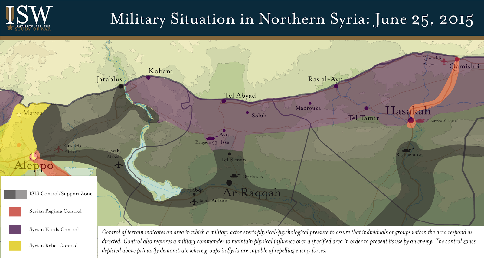 ISIS’s synchronized attacks in northern Syria likely represent part of an overarching campaign to contain its opponents in the area and set conditions for further advances in Syria. The attacks in Ayn al-Arab (Kobani) and Hasaka City appear designed to disrupt ongoing YPG-led anti-ISIS operations in northern ar-Raqqa Province in order to divert pressure away from core ISIS terrain in ar-Raqqa City. The scale of the ISIS offensive against Hasaka City also suggests that ISIS may intend to seize the city to offset recent losses to Kurdish and rebel forces along the Syrian-Turkish border at the border crossing of Tel Abyad as well as the town of Ayn Issa and its associated Brigade 93 base further south. At minimum, ISIS’s attacks in Ayn al-Arab and Hasaka City demonstrate that ISIS possesses sufficient resiliency to absorb losses in northern Syria without losing the capability to conduct military operations. Alternately, reports indicating that ISIS did not mount fierce resistance in either Tel Abyad or Ayn Issa suggest that ISIS may have accepted a degree of calculated risk north of ar-Raqqa City in order to conserve resources for new lines of effort targeting Hasaka City, central Syria, or other regions of the country.