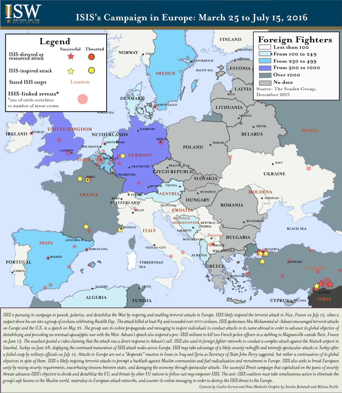 ISIS is pursuing its campaign to punish, polarize, and destabilize the West by inspiring and enabling terrorist attacks in Europe. ISIS likely inspired the terrorist attack in Nice, France on July 15, when a suspect drove his car into a group of civilians celebrating Bastille Day. The attack killed at least 84 and wounded over 200 civilians. ISIS spokesman Abu Mohammed al-Adnani encouraged terrorist attacks on Europe and the U.S. in a speech on May 21. The group uses its online propaganda and messaging to inspire individuals to conduct attacks in its name abroad in order to advance its global objective of destabilizing and provoking an eventual apocalyptic war with the West. Adnani’sspeech also inspired a pro-ISIS militant to kill two French police officers in a stabbing in Magnanville outside Paris, France on June 13. The assailant posted a video claiming that the attack was a direct response to Adnani’s call.ISIS also used its foreign fighter networks to conduct a complex attack against the Ataturk airport in Istanbul, Turkey on June 28, displaying the continued maturation of ISIS attack nodes across Europe. ISIS may take advantage of a likely security reshuffle and intensify spectacular attacks in Turkey after a failed coup by military officials on July 15. Attacks in Europe are not a “desperate”reaction to losses in Iraq and Syria as Secretary of State John Kerry suggested, but rather a continuation of its global objectives in spite of them.ISIS is likely inspiring terrorist attacks to prompt a backlash against Muslim communities and fuel radicalization and recruitment in Europe. ISIS also seeks to break European unity by raising security requirements, exacerbating tensions between states, and damaging the economy through spectacular attacks. Thesuccessful Brexit campaign that capitalized on the panic of security threats advances ISIS’s objective to divide and destabilize the EU, and threats by other EU nations to follow suit may empower ISIS. The anti-ISIS coalition must take simultaneous action to eliminate the group’s safe havens in the Muslim world, neutralize its European attack networks, and counter its online messaging in order to destroy the ISIS threat to the Europe.