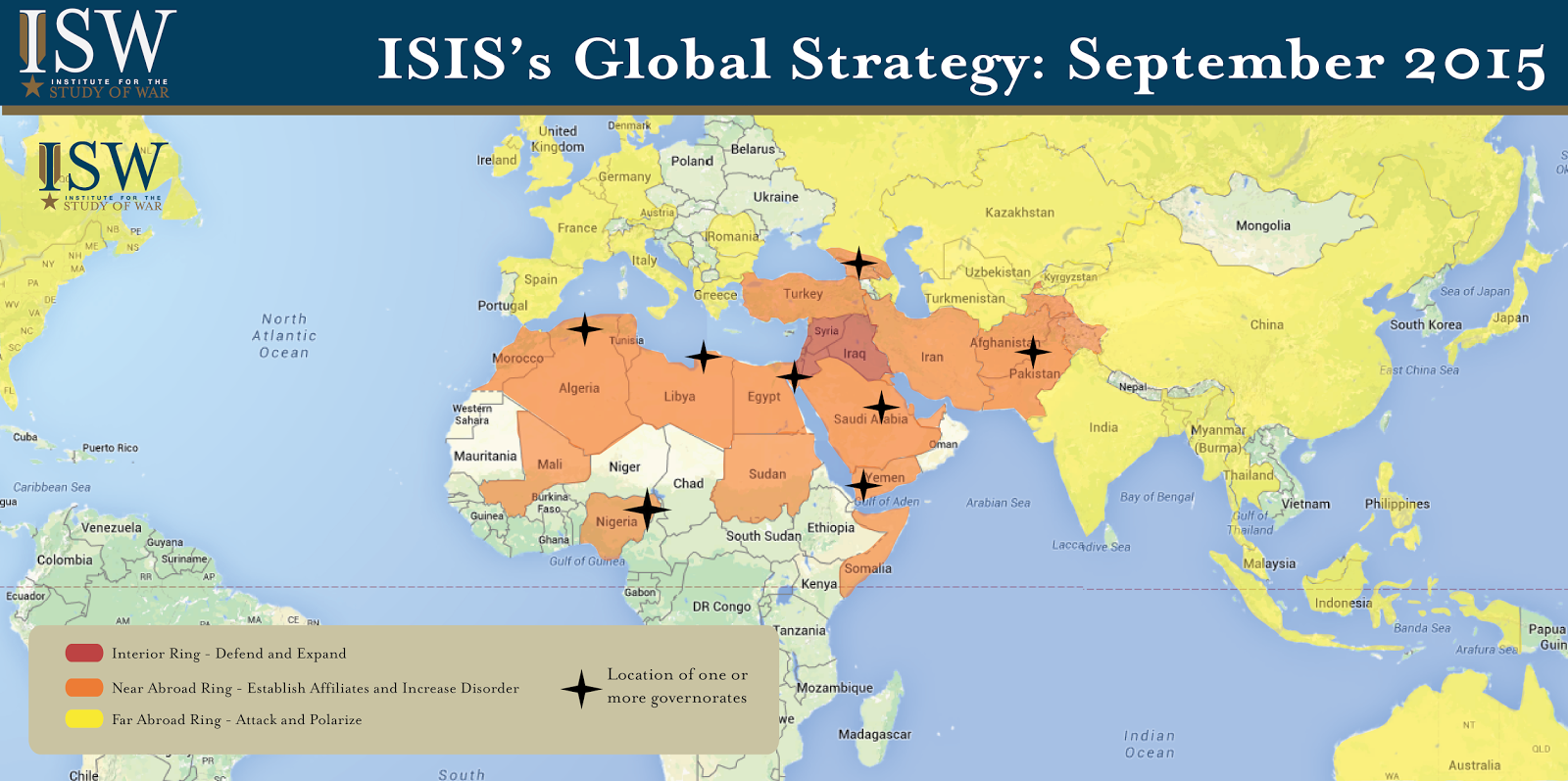 ISIS is executing a global strategy to defend and expand its territory within Iraq and Syria; to foster affiliates and exacerbate disorder in the Middle East, North Africa, and Central Asia; and to inspire and resource polarizing terror attacks in the wider world. The map depicts the geographic areas of those parallel campaigns, labeled the Interior, Near Abroad, and Far Abroad rings, respectively. The map also marks the areas where ISIS has declared one or more “wilayats,” or governorates in the Near Abroad. ISIS maintains active affiliates in each of its governorates, which provide the organization with strategic resiliency outside of Iraq and Syria.