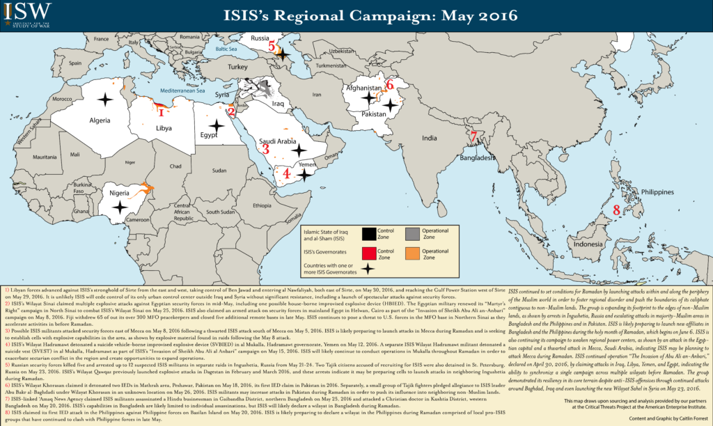 ISIS continued to set conditions for Ramadan by launching attacks within and along the periphery of the Muslim world in order to foster regional disorder and push the boundaries of its caliphate contiguous to non-Muslim lands. The group is expanding its footprint to the edges of non-Muslim lands, as shown by arrests in Ingushetia, Russia and escalating attacks in majority-Muslim areas in Bangladesh and the Philippines and in Pakistan. ISIS is likely preparing to launch new affiliates in Bangladesh and the Philippines during the holy month of Ramadan, which begins on June 6. ISIS is also continuing its campaign to weaken regional power centers, as shown by an attack in the Egyptian capital and a thwarted attack in Mecca, Saudi Arabia, indicating ISIS may be planning to attack Mecca during Ramadan. ISIS continued operation “The Invasion of Abu Ali an-Anbari,” declared on April 30, 2016, by claiming attacks in Iraq, Libya, Yemen, and Egypt, indicating the ability to synchronize a single campaign across multiple wilayats before Ramadan. The group demonstrated its resiliency in its core terrain despite anti-ISIS offensives through continued attacks around Baghdad, Iraq and even launching the new Wilayat Sahel in Syria on May 23, 2016.