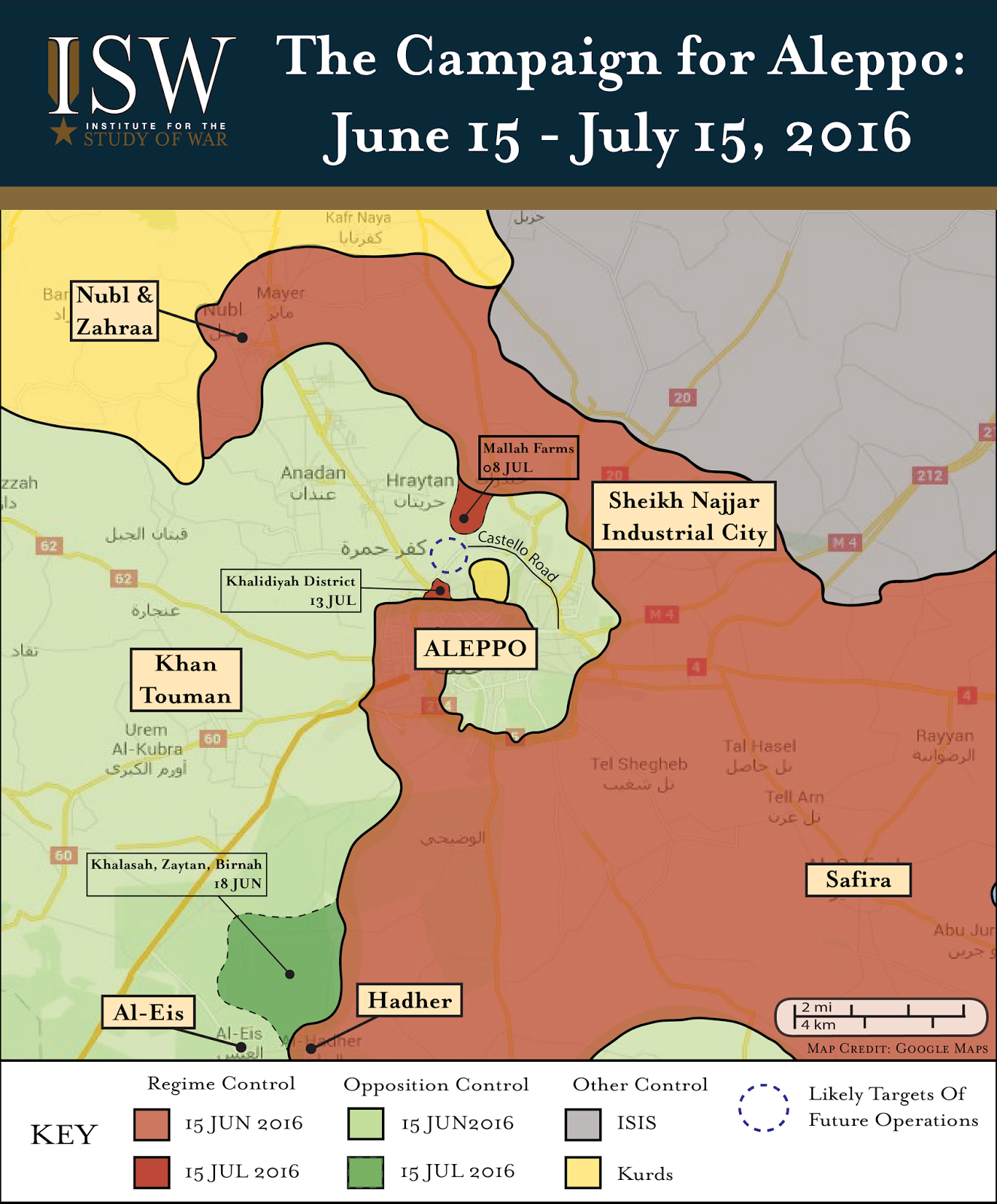 Syrian President Bashar al-Assad is within two miles of besieging over 200,000 civilians in Aleppo City. Pro-regime forces established fire control over the primary ground line of communication into opposition-held districts of Aleppo City on July 8 after seizing a key hill overlooking the Castello Highway north of the city. Regime forces including the elite Syrian Arab Army Republican Guardlater launched an offensivein the Khalidiyah Industrial District of Northern Aleppo City on July 12, advancing from the south towards the Castello Road. The advances mark the latest high-water mark in a multi-phase campaign to encircle and besiege Syria’s largest urban center, an effort that began in October 2015 with support from Russian airpower and Iranian ground reinforcement. The Assad regime has long relied upon siege-and-starve tactics in order to force the submission of opposition pockets throughout the Syrian Civil War. The threat of a looming siege in Aleppo has already begun to impact conditions in neighborhoods across the city. The price of staple foods such as flour and rice reportedly more than tripled over the past few days as municipal leaders implemented mandatory rationing and fell back upon prepared stockpiles of supplies. The UN Office for the Coordination of Humanitarian Affairs (OCHA) warnedon July 13 that humanitarian agencies only have enough assistance in position to provide one month of food for 145,000 out of an estimated 200,000 to 300,000 civilians living in opposition-held parts of Aleppo City.