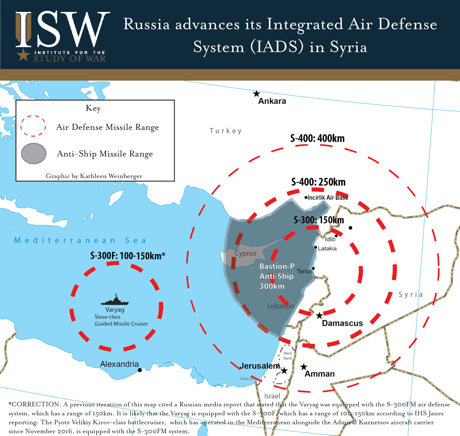 *CORRECTION: A previous iteration of this map cited a Russian media report that stated that the Varyag was equipped with the S-300FM air defense system, which has a range of 150km. It is likely that the Varyag is equipped with the S-300F, which has a range of 100-150km according to IHS Janes reporting. The Pyotr Velikiy Kirov-class battlecruiser, which has operated in the Mediterranean alongside the Admiral Kuznetsov aircraft carrier since November 2016, is equipped with the S-300FM system.