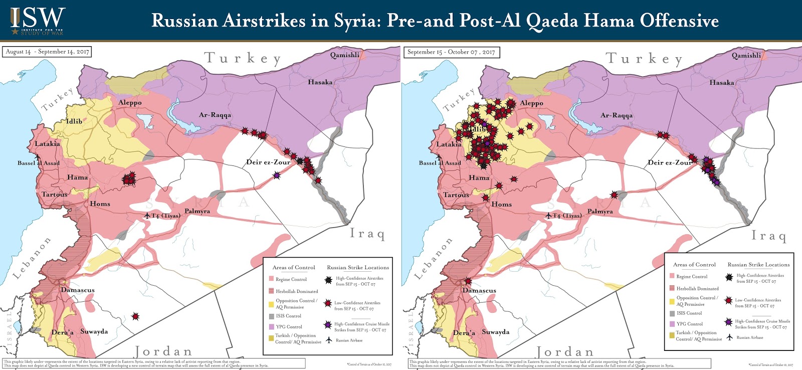 The following graphic depicts ISW’s assessment of Russian airstrike locations based on reports from local Syrian activist networks, statements by Russian and Western officials, and documentation of Russian airstrikes through social media. This map represents locations targeted by Russia’s air campaign, rather than the number of individual strikes or sorties. The graphic likely under-represents the extent of the locations targeted in Eastern Syria, owing to a relative lack of activist reporting from that region.