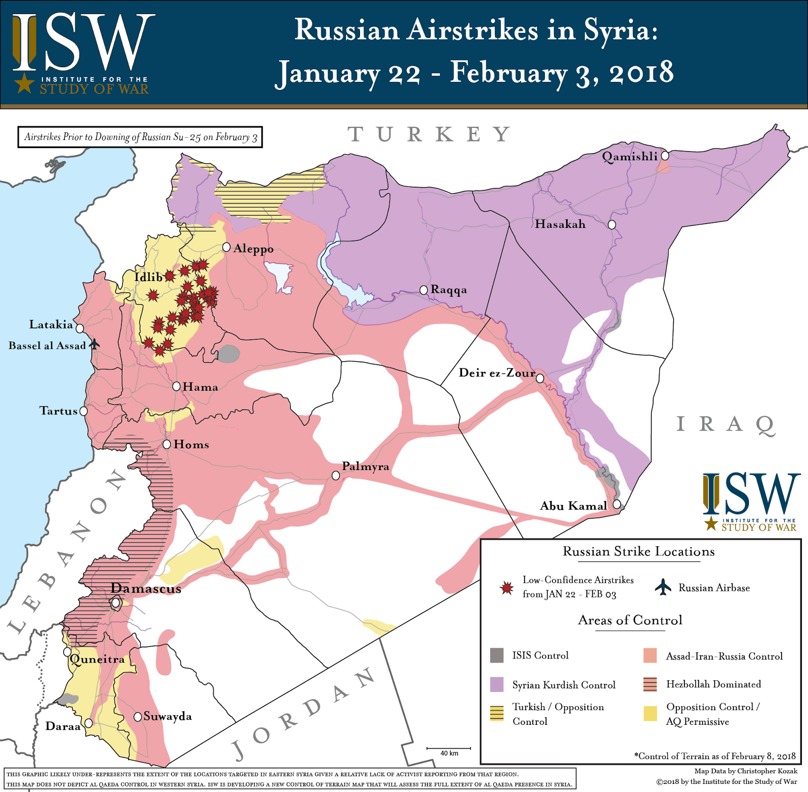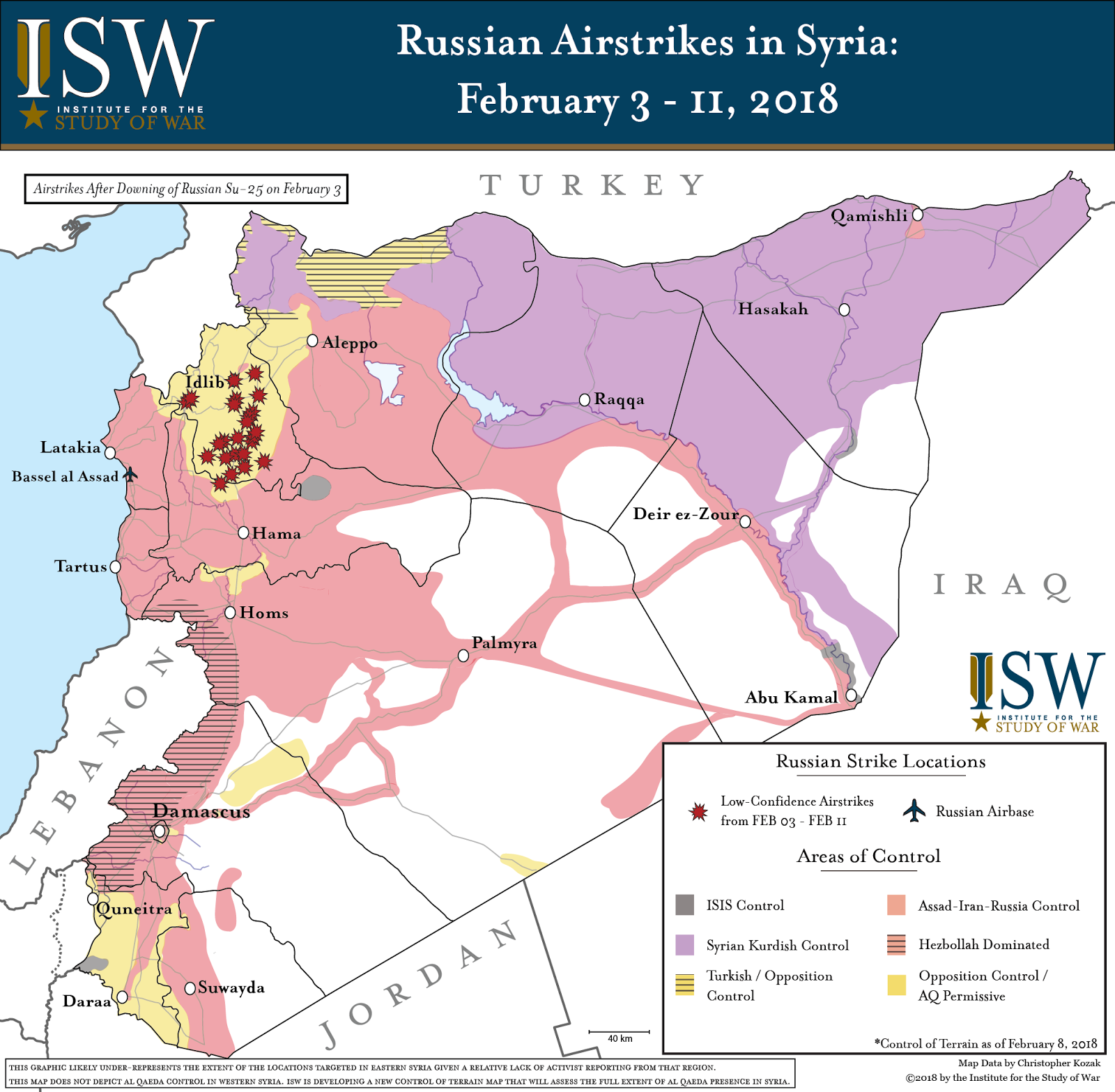Russia adjusted its air operations after the combat loss of one of its warplanes in early February. Hay’at Tahrir al-Sham (HTS) – Al-Qaeda’s affiliate in Syria – claimed responsibility for the downing of a Russian Su-25 ‘Frogfoot’ near Saraqib with a Man-Portable Air Defense System (MANPADS) on February 3. The Russian Armed Forces in response ordered all warplanes to increase their flight altitude outside the range of potential MANPADS. Russia also reportedly deployed new electronic air defense and surface-to-air missile systems to Northern Syria. Russia simultaneously launched a punitive air campaign targeting key civilian infrastructure across Greater Idlib Province including Idlib City and Jisr al-Shughur on the Syrian-Turkish Border. Pro-regime aircraft also intensified their air and artillery bombardment of the opposition-held Eastern Ghouta Suburbs of Damascus, killing at least 200 civilians. Russia likely participated in these strikes, although ISW could not validate a low-confidence strike during the reporting period.