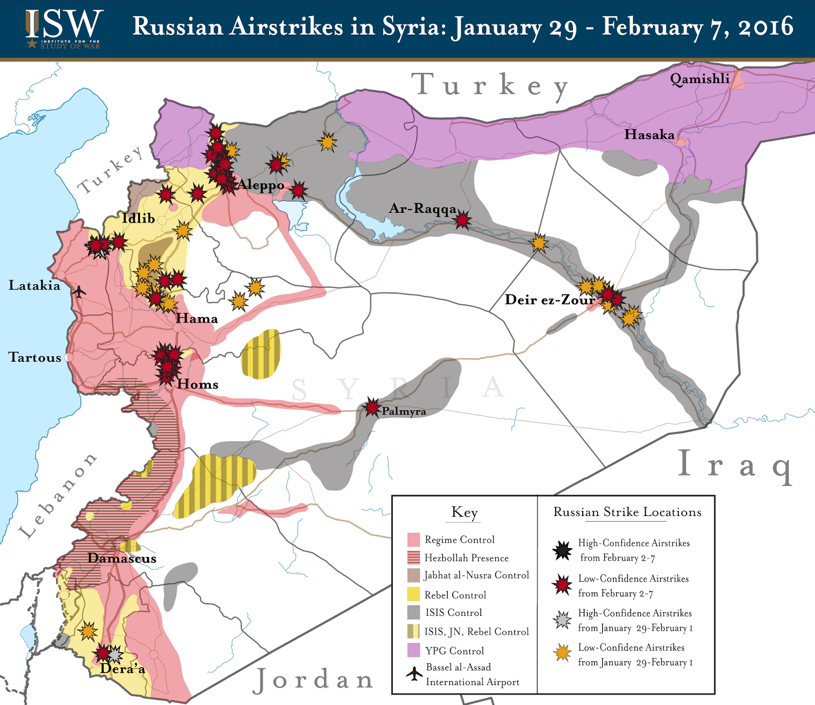 Russia’s four month long air campaign has set conditions for the encirclement of Aleppo. Pro-regime forces backed by heavy Russian airstrikes severed one of two opposition supply lines into Aleppo City from the Turkish border on February 3 when they pushed northwest of the city to reestablish a regime supply line to the besieged regime towns of Nubl and Zahra’a. Iranian Revolutionary Guard Corps fighters and Iranian-backed Shi’a militia forces played a prominent role in the offensive, demonstrating the lethality of combined Russian air and Iranian ground operations against the opposition in Syria. Reports of Russian Spetnaz activity at unspecified locations in Aleppo Province likely indicate the involvement of these forces in the operation. The gains position pro-regime forces to encircle opposition-held portions of Aleppo City by severing the last remaining opposition supply line that runs east from the Turkish border into the city. The regime can sever this final supply line at two locations: an outer location northwest of Aleppo City on the road to the Turkish border that passes through the towns of Huraytan and Kafr Hamra, or an inner location in the city’seastern sector controlled by the armed opposition, such as the Hanano District. Russia’s air campaign has consistently targeted the outer location for the past three months, indicating that this is where pro-regime forces intend to complete the encirclement. This section of the supply line runs through rural terrain that Russian airpower can easily target and Iranian-backed ground forces can ultimately seize, whereas the inner location is more difficult as the terrain includes both topographic and urban barriers to rapid ground offensives. Pro-regime forces are meanwhile taking steps to buffer their forward line of troops (FLOT)to the north of Aleppo to make it possible to sustain the encirclement.Pro-regime forces will likely complete the encirclement of Aleppo in coming weeks and besiege the opposition inside the city in order to force Turkey and Saudi Arabia to concede to a negotiated settlement or ceasefire.