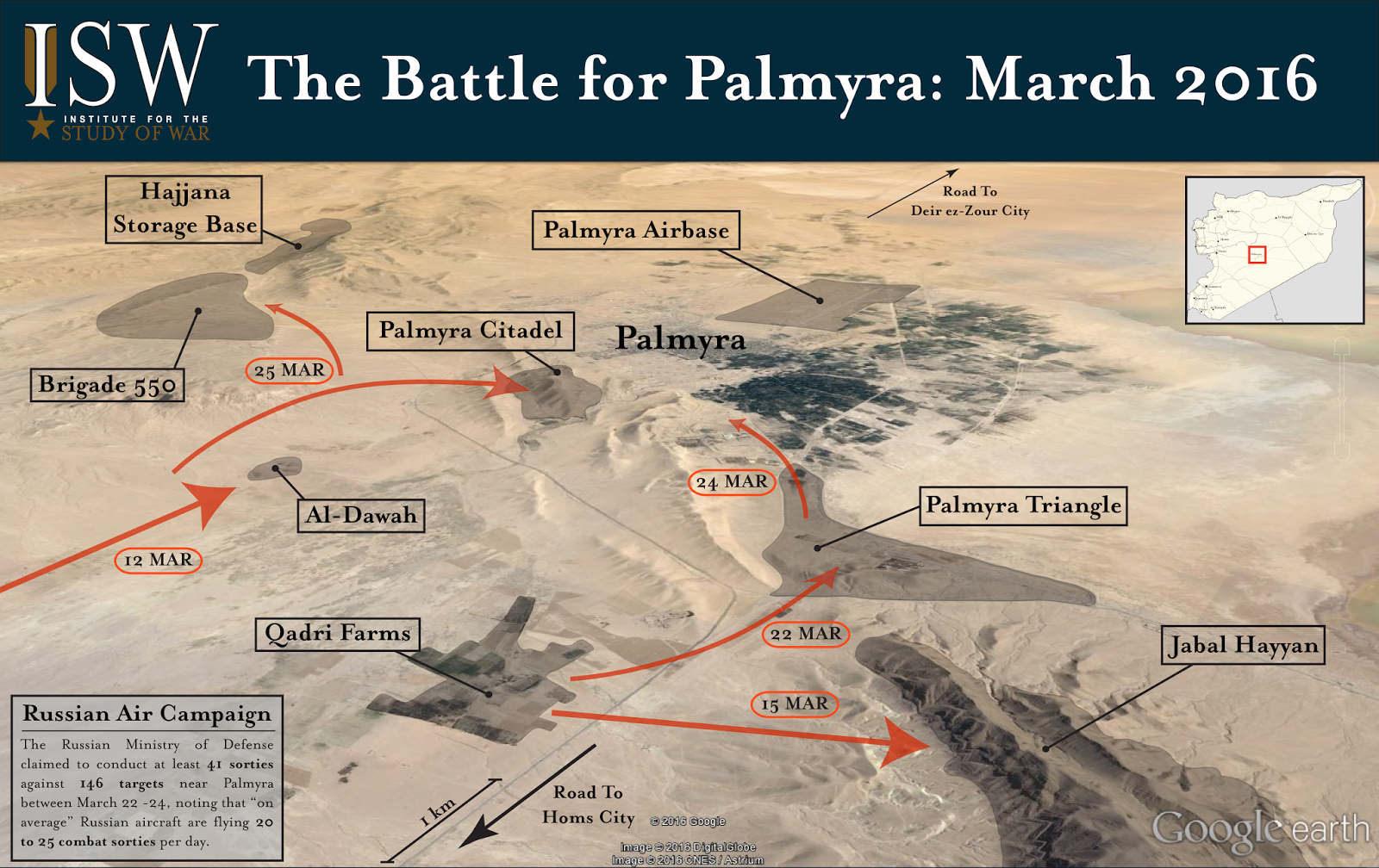 The fall of Palmyra represents a major victory on the international stage for both Syrian President Bashar al-Assad and Russian President Vladimir Putin. The new gains allow the Russian-Iranian-Syrian coalition to claim a significant win in the fight against ISIS, bolstering its narrative as the ideal partner in the anti-ISIS campaign. This message may stand to gain additional traction within Europe in the aftermath of a major terrorist attack by ISIS in Brussels, Belgium on March that killed thirty-one civilians and wounded several hundred others. The advance also bolsters the current position of strength held by Syrian President Bashar al-Assad amidst the ongoing Geneva III Talks to end the Syrian Civil War. The seizure of Palmyra curtails the ability of ISIS to project force into Western Syria from its safe haven along the Euphrates River Valley and provides a much-needed buffer for several critical regime-held oil and natural gas fields that provide electricity to Western Syria. The regime and its allies will likely leverage Palmyra and its military facilities as an optimal forward position for follow-on operations against ISIS in Ar-Raqqa and Deir ez-Zour Cities, complicating the position of the U.S.-led coalition in the region.