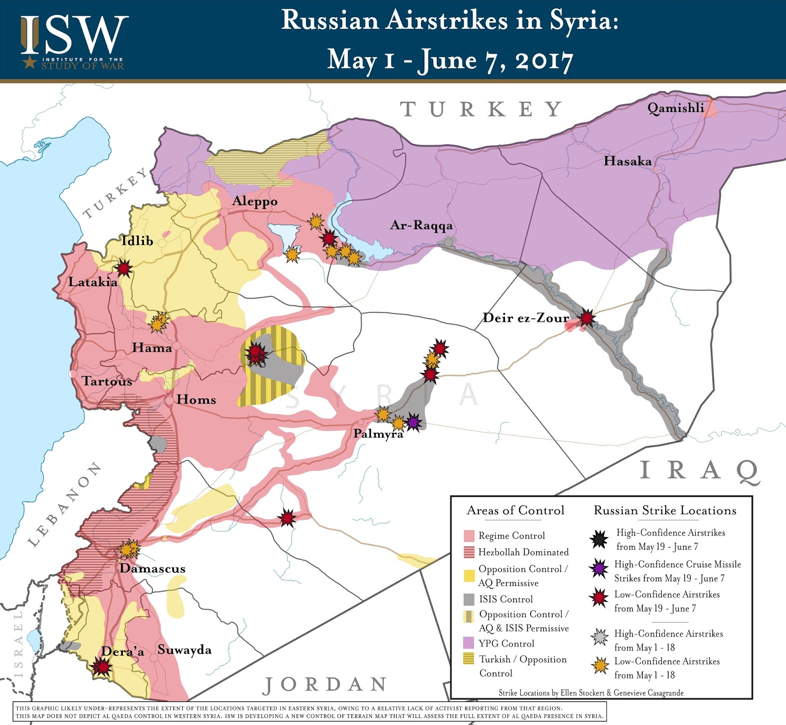 Russia has reshaped its military campaign in Syria to constrain theU.S.’s current operations and future options. Russia deprioritized its airstrikesagainst opposition-held terrain in Western Syria following the announcement offour ‘de-escalationzones’brokered by Russia, Iran, and Turkey on May 6. Russia claimed this shift was a continuationof its supposed counter-terrorism campaign in Syria. Russia’s actual target forthis new operational phase is not ISIS or Al-Qaeda, but rather the U.S. and itspartners and allies.