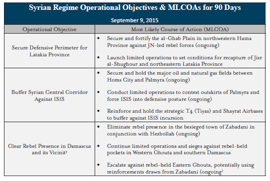 • [Syrian Regime] Maintain Syrian territorial integrity through an ‘army in all corners’; consolidate Syrian civilian population in regime-held areas; bolster international and domestic legitimacy as ruler of Syria.