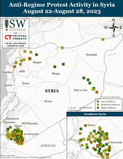 Anti-regime protests have grown and become more organized in Suwayda Province while declining in the rest of Syria. Suwayda Province has become the well-organized center of the anti-regime protest movement as organizers demonstrate a greater ability to direct and sustain constant demonstrations and issue new demands. ISW recorded two instances of limited regime intimidation in Suwayda Province such as threats and firing into the air throughout the movement.[1] Regime suppression and a lack of organizational networks outside the province have resulted in a decline in protest span, frequency, and turnout, however. ISW recorded 11 protests in the rest of regime-held Syria between August 29 and September 4 compared to 43 during the previous week.[2] This updates ISW’s assessment that anti-regime protests are gaining traction in Syria and that the protests could expand during the coming weeks.