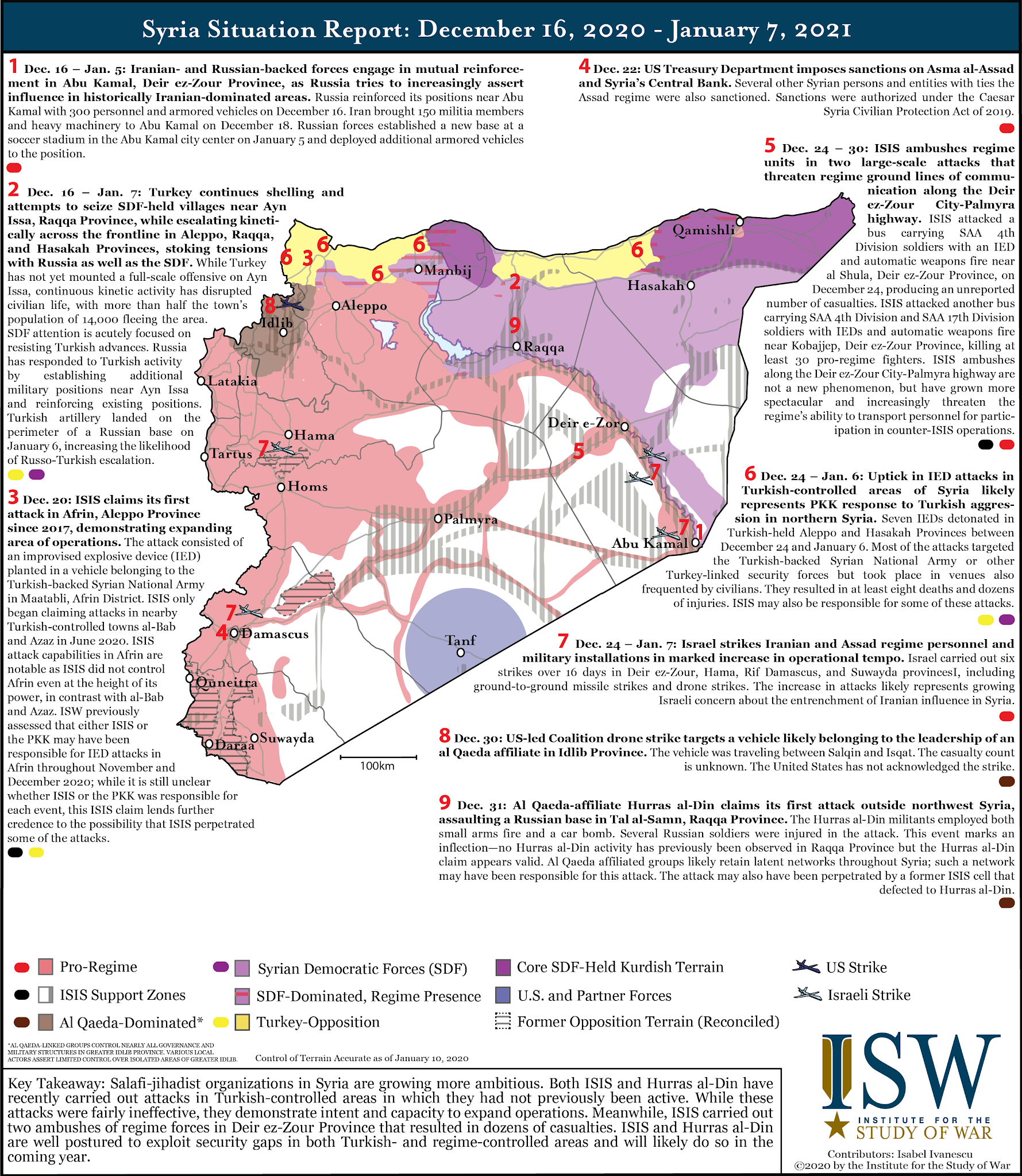 Key Takeaway: Salafi-jihadist organizations in Syria are growing more ambitious. Both ISIS and Hurras al-Din have recently carried out attacks in Turkish-controlled areas in which they had not previously been active. While these attacks were fairly ineffective, they demonstrate intent and capacity to expand operations. Meanwhile, ISIS carried out two ambushes of regime forces in Deir ez-Zour Province that resulted in dozens of casualties. ISIS and Hurras al-Din are well postured to exploit security gaps in both Turkish- and regime-controlled areas and will likely do so in the coming year.