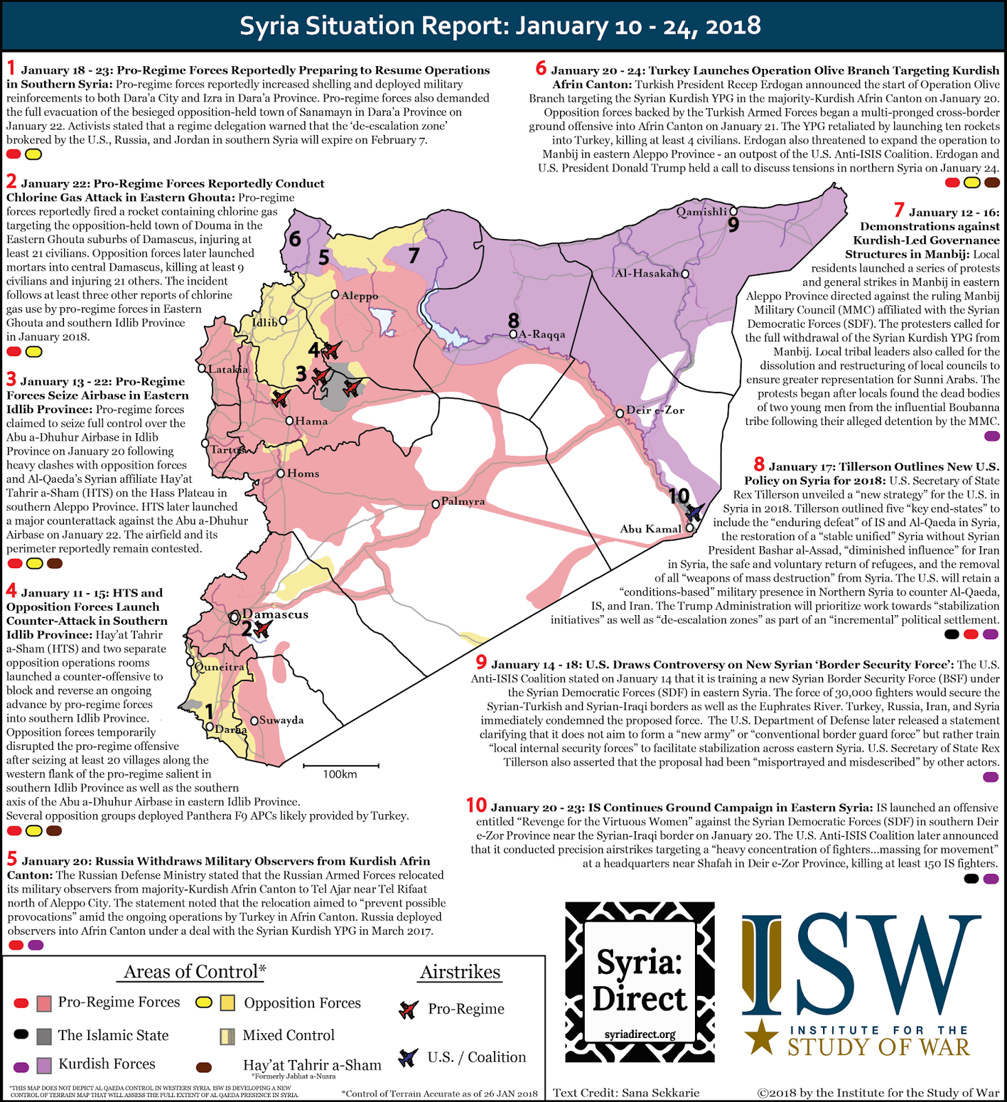 This graphic marks the latest installment of our Syria SITREP Map made possible through a partnership between the Institute for the Study of War and Syria Direct. This graphic depicts significant developments in the Syrian Civil War from January 10 to January 24, 2018. The control of terrain represented on the graphics is accurate as January 26, 2018.