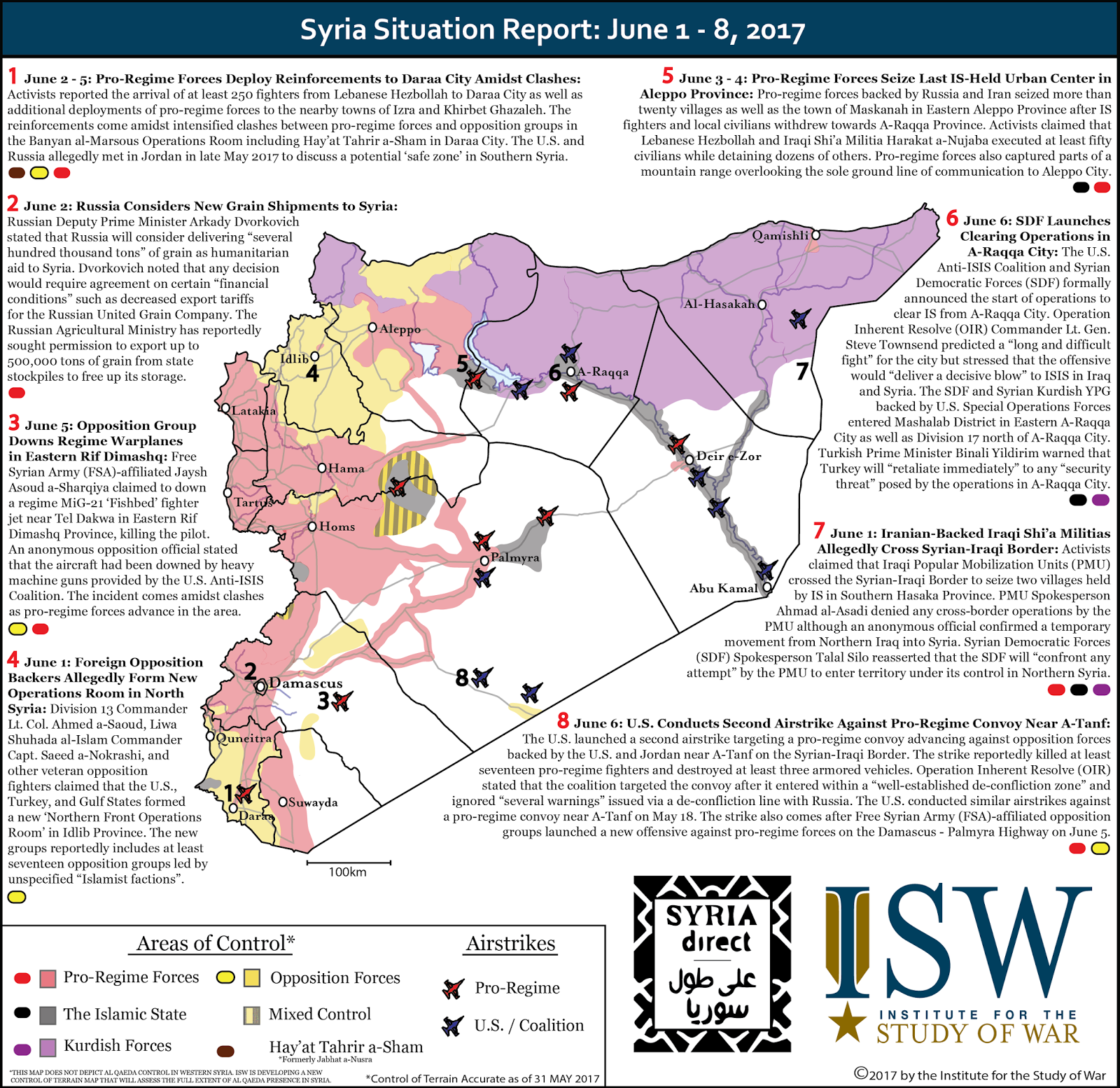 This graphic marks the latest installment of our Syria SITREP Map made possible through a partnership between the Institute for the Study of War and Syria Direct.This graphic depicts significant recent developments in the Syrian Civil War.The control of terrain represented on the graphic is accurate as of May 31,2017.