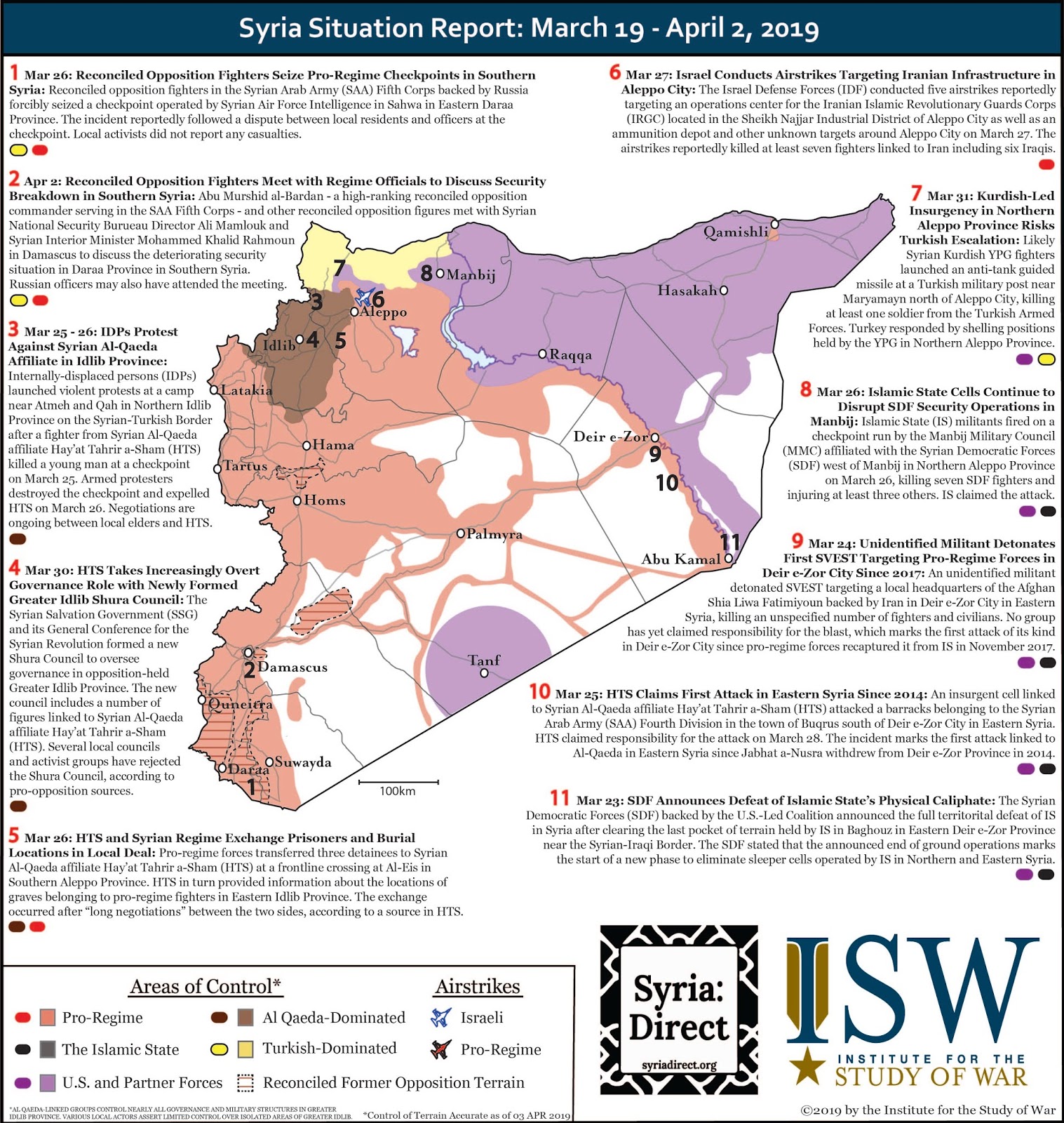 The following graphic marks the latest installment of the Syria Situation Report (SITREP) Map made possible through a partnership between the Institute for the Study of War (ISW) and Syria Direct. The map depicts significant developments in the war in Syria during the period March 19 – April 2, 2019.