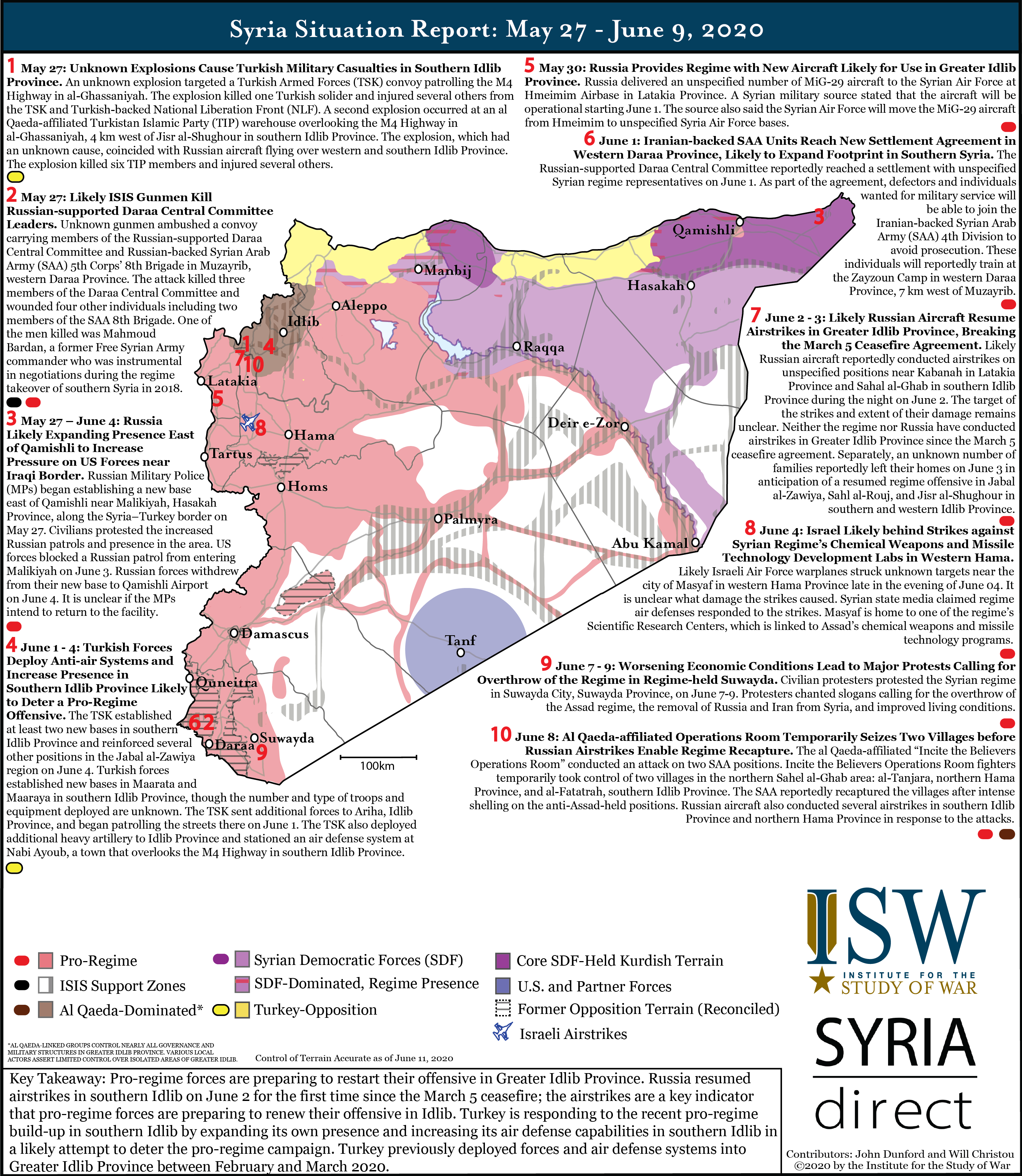 Key Takeaway: Pro-regime forces are preparing to restart their offensive in Greater Idlib Province. Russia resumed airstrikes in southern Idlib on June 2 for the first time since the March 5 ceasefire; the airstrikes are a key indicator that pro-regime forces are preparing to renew their offensive in Idlib. Turkey is responding to the recent pro-regime build-up in southern Idlib by expanding its own presence and increasing its air defense capabilities in southern Idlib in a likely attempt to deter the pro-regime campaign. Turkey previously deployed forces and air defense systems into Greater Idlib Province between February and March 2020.
