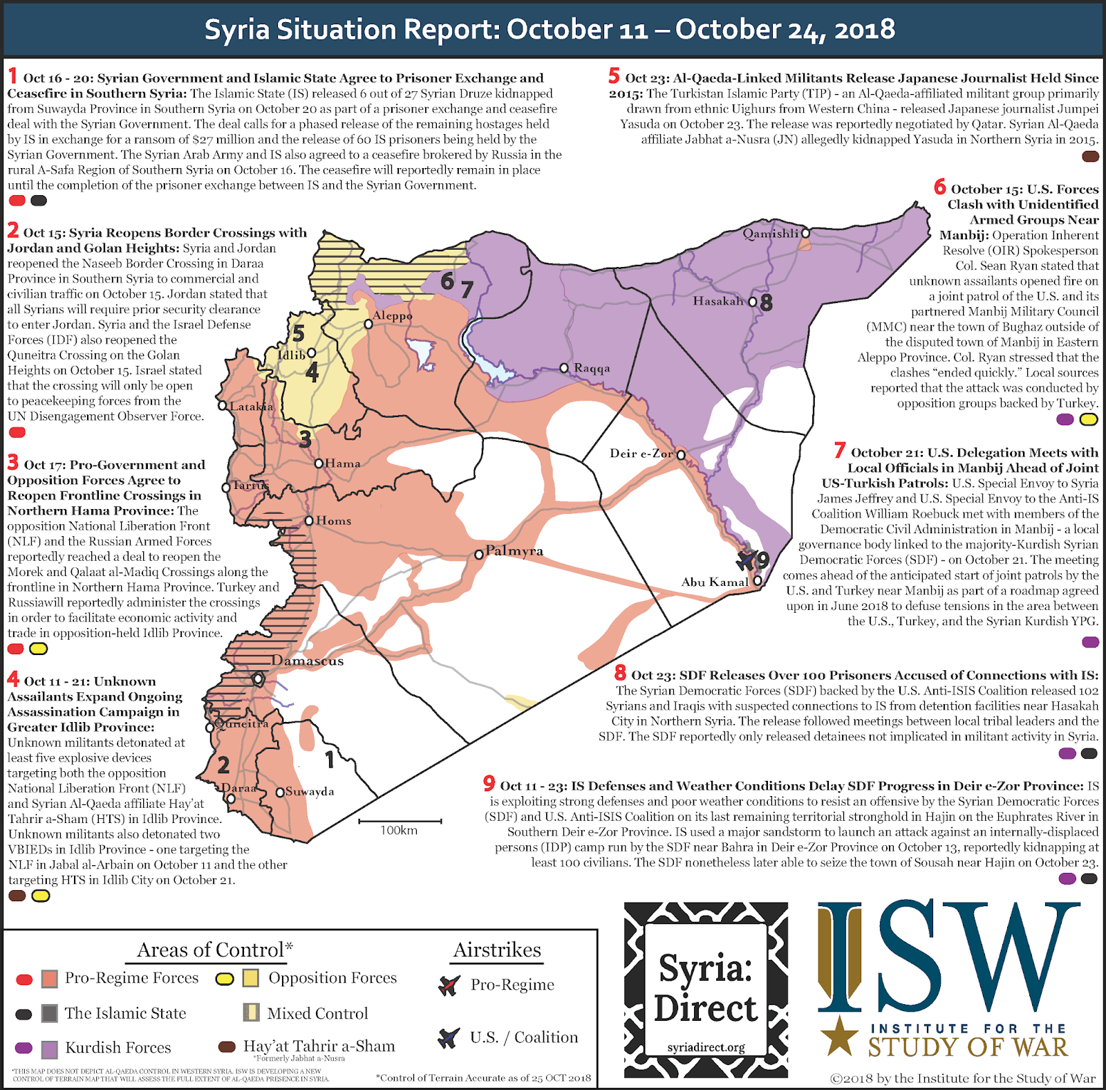This graphic marks the latest installment of the Syria Situation Report (SITREP) Map made possible through a partnership between the Institute for the Study of War (ISW) and Syria Direct. The map depicts significant developments in the war in Syria during the period October 11 – October 24, 2018.