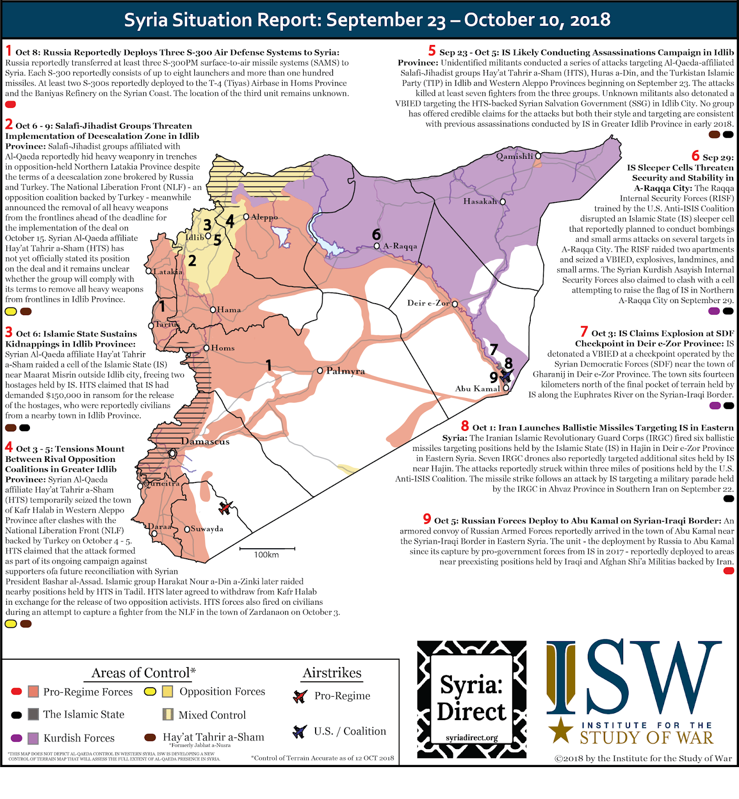 This graphic marks the latest installment of the Syria Situation Report (SITREP) Map made possible through a partnership between the Institute for the Study of War (ISW) and Syria Direct. The map depicts significant developments in the war in Syria during the period September 23 – October 10, 2018.