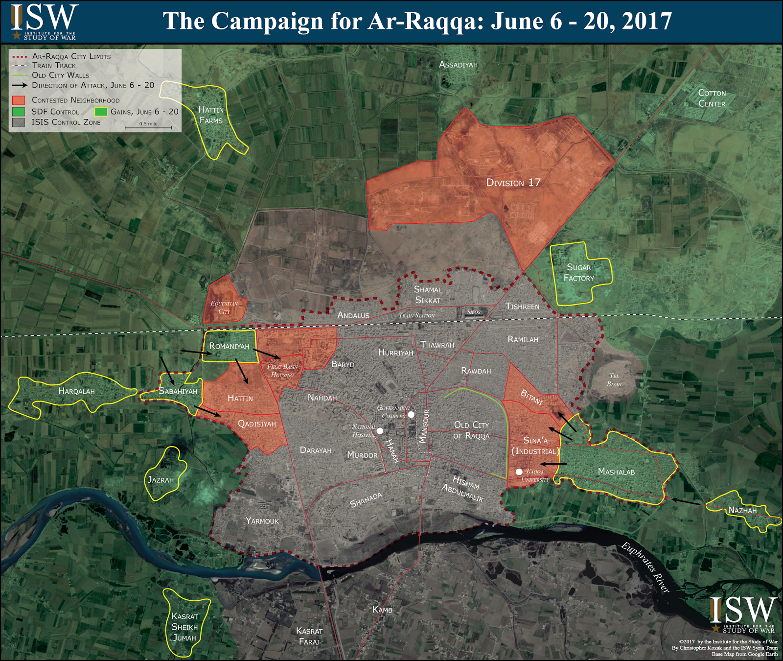 The U.S. Anti-ISIS Coalition and Syrian Democratic Forces (SDF) beganoperations to clear ISIS from Ar-Raqqa City in NorthernSyria on June 6. This urban combat phase marks the culmination of successful shapingoperations conducted over the last eight months to isolate Ar-Raqqa City under OperationEuphrates Wrath. These operations included the seizure of the TabqaDam in Western Ar-Raqqa Province on May 10. Ar-RaqqaCity is currently isolated along its three axes with only limited water trafficto the south across the Euphrates River. The fight for the city willnonetheless prove difficult. ISIS retains at least2,500 fighters in the city behind an elaborate systemof berms, tunnels, improvised explosive devices, and other defenses “verysimilar” to its posture in Mosul, Iraq. ISIS’s forces areintermingled with an estimated 50,000to 100,000 civilians, raising the complexity andrequirements of ongoing clearing operations. ISIS has thus far mounted a kinetic defense, ceding some outlying districts in favor of raids, ambushes, sleepercells, and suicide attacks as the group falls back towards the dense urban coreof Ar-Raqqa City. The capability of the SDF – a coalition of irregular forcesdominated by the Syrian Kurdish YPG – to sustain its offensive and overcomethese challenges remains doubtful despite expansive support from the U.S.Anti-ISIS Coalition.