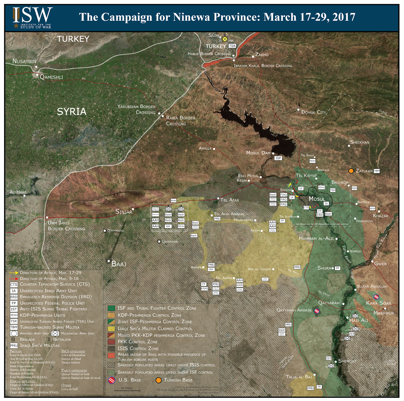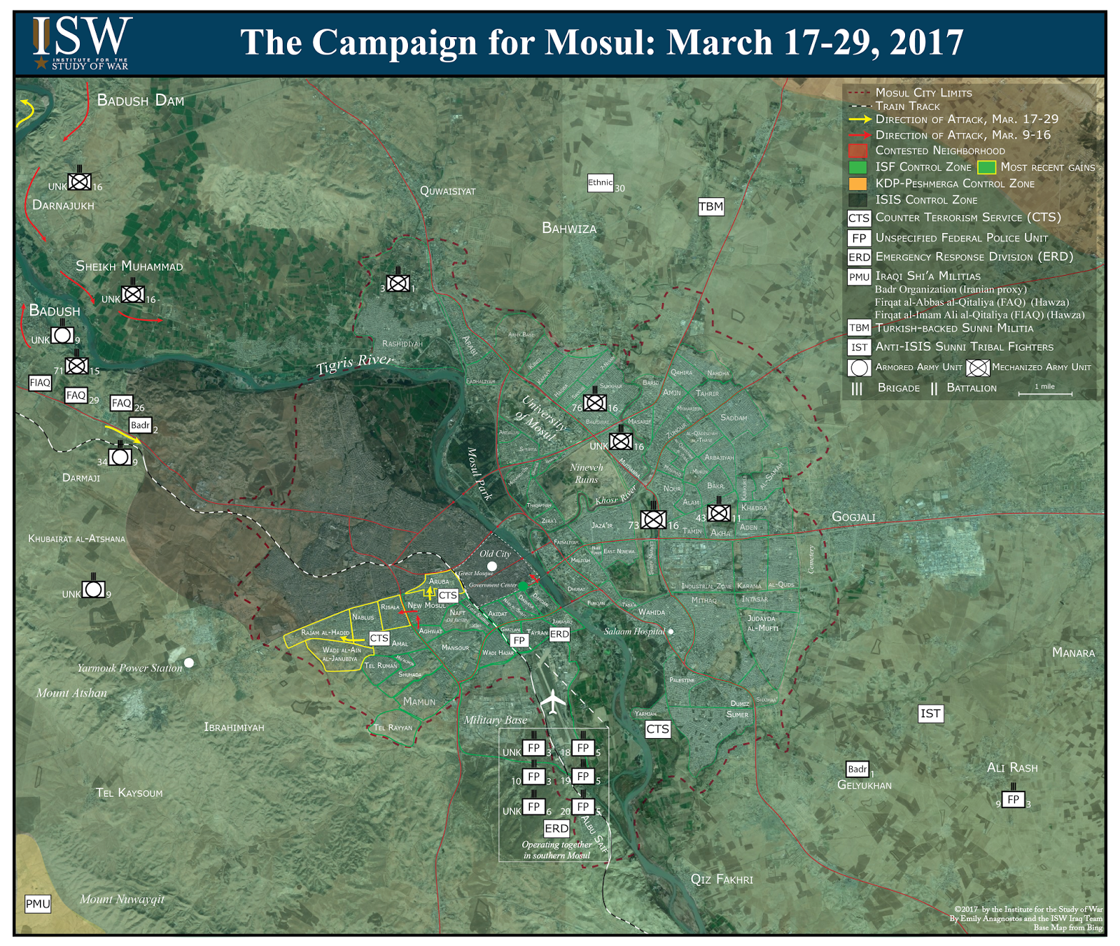 The Iraqi Security Forces (ISF) slowed its advance into western Mosul on March 26 in order to regroup and prepare for an assault on the Old City, the densest part of western Mosul in terms of both population and infrastructure. The U.S. is deploying an additional 240 soldiers to Mosul, likely to support a final push through the Old City. The ISF has also slowed its operation out of continued concerns of civilian casualties throughout the western Mosul operation. Humanitarian concerns flared when local sources claimed that a Coalition airstrike on March 17 killed as many as 200 civilians. Meanwhile, Iran is deepening the role of its proxy Badr Organization in Ninewa Province to influence the post-ISIS security and political structure in the province.
