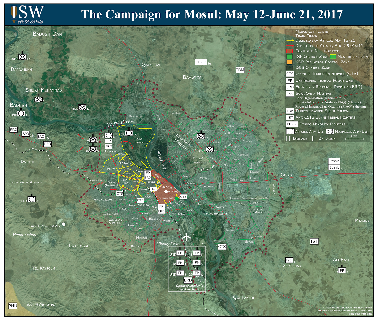 ISIS is conducting spectacular attacks on security services,civilians, and symbolic sites in order to detract from Mosul and Ninewa Province operations and to prevent the emergence of a stable post-ISIS state. Iraqi Security Forces (ISF) recaptured 12 neighborhoods in northwest Mosul,tightening the noose around ISIS in Mosul’s Old City. ISIS responded with attacks to the north, south, and west of the Old City on June 14. An estimated 100,000 civilians remain trapped in ISIS-held areas of the city. ISF created evacuation routes, however, ISIS militants have shot or executed civilians attempting to flee. ISIS also destroyed al-Nuri Great Mosque on June 21. ISIS leader Abu Bakr al-Baghdadi declaredthe “caliphate” from this mosque in 2014.