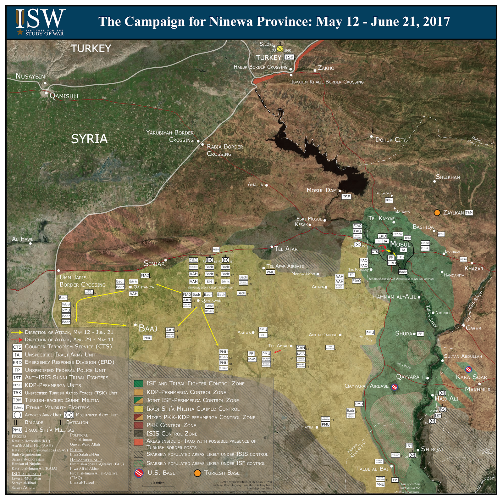 ISIS seeks to undermine ISF morale and devastate Mosul’sinfrastructure, thereby diminishing the value of the city’s liberation and prospects for post-ISIS governance and security. The 15th Iraqi Army Division cleared areas west of Mosul near Mount Badush in its advance toward ISIS-held Tel Afar. Iran-backed Popular Mobilization Units (PMU) meanwhile began surrounding Qayrawan on May 13, and had reached the Syrian border by June 2. The operation included seizing Baaj, Baghdadi’s former safe haven,on June 4. ISIS countered these gains by launching ground attacks on Hatra, south and west of Shirqat, Mount Badush, and near the Iraq–Syria border. Iran played a prominent role in the operations; senior Islamic Revolutionary Guards Corps commander Shaaban Nassiri died in clashes near Baaj on May 27 and Lebanese Hezbollah commander Abd al-Hamid Mahmoud Shari diednear Qayrawan on June 2. Iran seeks to hinder U.S. freedom of maneuver along the Iraq-Syria border by maintaining a border presence and shaping post-Mosul security in Iraq. It may also hope to position its proxies to lead Hawijah’srecapture rather than U.S.-backed forces.