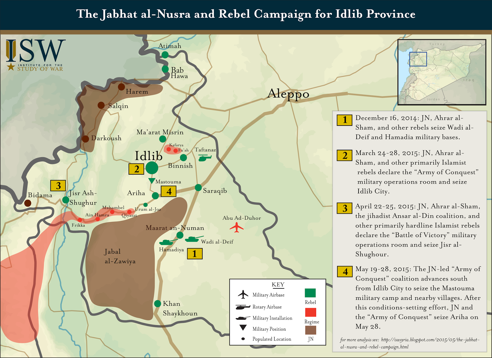 Syrian al-Qaeda affiliate Jabhat al-Nusra (JN) seized control of Ariha, the final regime stronghold in Idlib Province, alongside allied Islamist rebels on May 28, 2015. This victory secures effective control over Idlib Province to JN and rebel forces, the second Syrian province to fall out of Assad’s control after ISIS-held Raqqa. A number of isolated and besieged regime positions remain in Idlib, including the Abu ad-Duhor military airbase that has been under JN siege since December 2014. Regime forces have reportedly begun to withdraw from villages along the Ariha- Jisr al-Shughour road as they absorb the loss of Ariha, indicating that JN and rebel forces are unlikely to face considerable resistance as they move to consolidate control over remaining pockets of regime-held terrain. Moderate rebel forces in the province played relatively marginal roles in the recent advances, often limited to providing artillery and other support to hardline Islamist and jihadist groups allied to JN. As a result, JN and its allies are likely to acquire a high level of influence in the governance and security structures that emerge in the newly-“liberated” province as a consequence of their significant military contributions to anti-Assad victories. This is a major strategic setback for the U.S. in Syria, as it cements JN gains in northern Syria to date, validates its methodology, and provides considerable momentum to its carefully tailored effort to mold rebel-held Syria into a post-Assad state that is governed by Shari’a law and ultimately a component of al-Qaeda’s envisioned global Caliphate. The regime continues to respond to military defeats with the indiscriminate use of airpower, barrel bombs, and weaponized chlorine gas attacks, and can be expected to maintain its effort to punish civilian populations in Idlib as anti-Assad forces formalize their control.