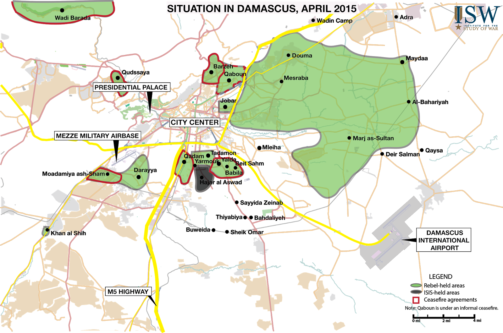 The elimination of the opposition threat to the Syrian capital of Damascus formed the second core component of the Assad regime’s military strategy. Durable control over the formal seat of government and the home of several million Syrian citizens provides the Syrian regime with a solid claim to domestic and international legitimacy. Damascus is also key terrain from a military perspective due to the high number of airbases, military installations, and elite SAA units present in the vicinity of the city. Damascus also serves as a key transit route for shipments of Iranian weapons and equipment to Lebanese Hezbollah and other proxy forces via the Damascus International Airport. Rebel forces began actively contesting the capital in early 2012 and currently hold large swathes of the eastern and southern suburbs of the city.