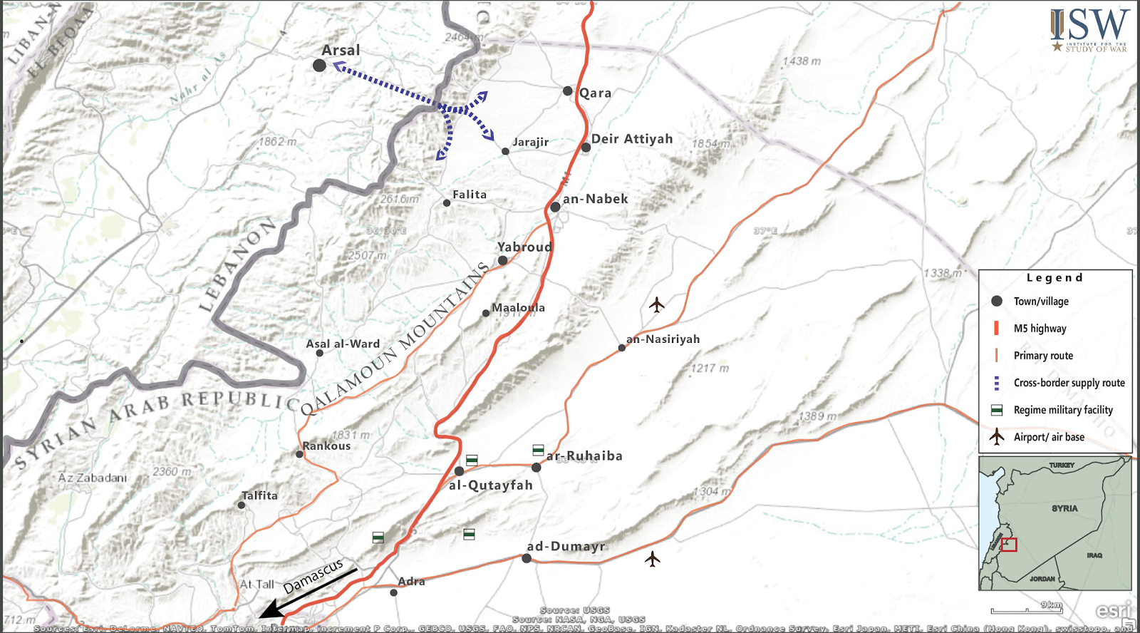 The Assad regime sought to clear and hold the Qalamoun Mountains, a strategic region northeast of the capital running along the Lebanese border, in order to defend the northern approaches to the capital and maintain access to the M5 Highway connecting Damascus to Homs, Hama, and the Syrian coast. The establishment of a strong regime presence along the border region also served to sever cross-border rebel supply lines based out of eastern Lebanon. Thus, regime forces launched a major operation to clear the Qalamoun on November 15, 2013. The timing of this offensive coincided with the end of major regime combat operations to clear the supply line to Aleppo city in an indication of the military advantage enjoyed by the Assad regime in late 2013. Lebanese Hezbollah fighters played a key role in the offensive, providing strained and inadequately equipped regime units with large amounts of manpower skilled in mountain warfare.