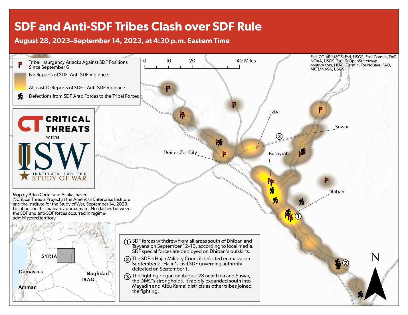 The coalition between the Syrian Democratic Forces (SDF) and the Arab tribes in Deir ez Zor is fracturing amid clashes over long-standing grievances. The SDF’s response to the clashes very likely will undermine its ability to maintain control in the province for at least the next several months. The SDF and the Deir ez Zor Military Council (DMC) began fighting after the SDF arrested the DMC commander on August 27. The conflict rapidly expanded after August 30, as other tribes joined the fighting driven by long-running grievances against the SDF.[1] These grievances included limited reconstruction in the Arab areas, repeated SDF abuses of the local populations, and a lack of representative Arab leadership.[2] The tribes captured the southern areas of SDF-administered Deir ez Zor province by September 2.[3] The SDF recaptured the territory on September 10 by force and through actions that local media portrayed as abuses. Anti-SDF tribal fighters began conducting hit-and-run insurgent attacks on September 6, meaning anti-SDF forces are contesting the SDF’s control of the population in Deir ez Zor. CTP defines control as “uncontested physical or psychological pressure to ensure that individuals or groups respond as directed.”[4] The SDF has not taken steps to address the tribes’ grievances as of September 14.[5]