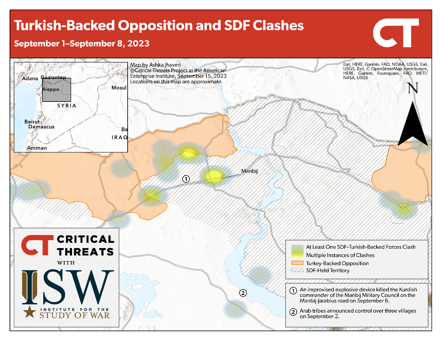 - The SNA opened border crossings between the Turkish-held and SDF-held areas in Manbij and Al Bab to local tribal members willing to join their fight against the SDF on September 1.[45] Tribes from Turkish-held areas have launched multiple attacks on SDF positions in Manbij.[46]