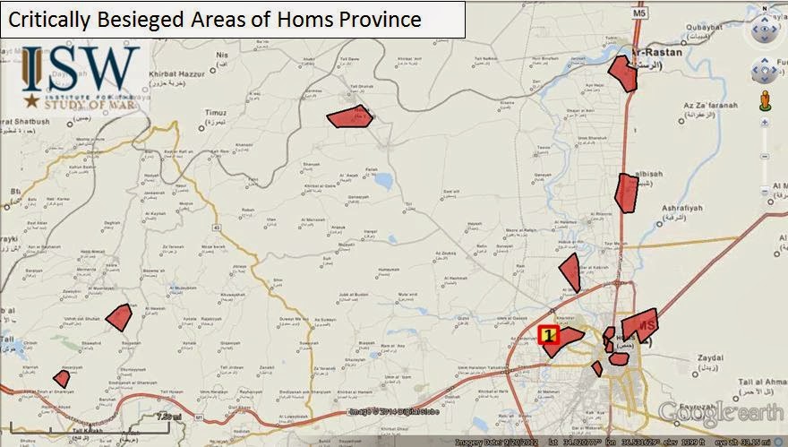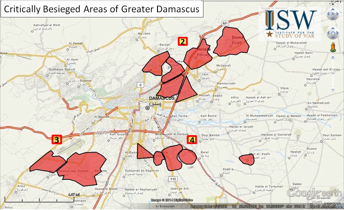 The United Nations estimates that over 250,000 people are trapped in besieged areas of Syria. The majority of these areas are besieged by the Syrian regime, which has called it a “Starvation Until Submission Campaign.” Currently, the most critical areas where civilians are at greatest risk of starvation are in and around Homs and Damascus as depicted in the maps below. There are indications that the Assad regime is trying to enact similar sieges in Aleppo as it uses barrel bombs to cut opposition supply routes. These sieges have played an increasingly important role in the regime’s war strategy.