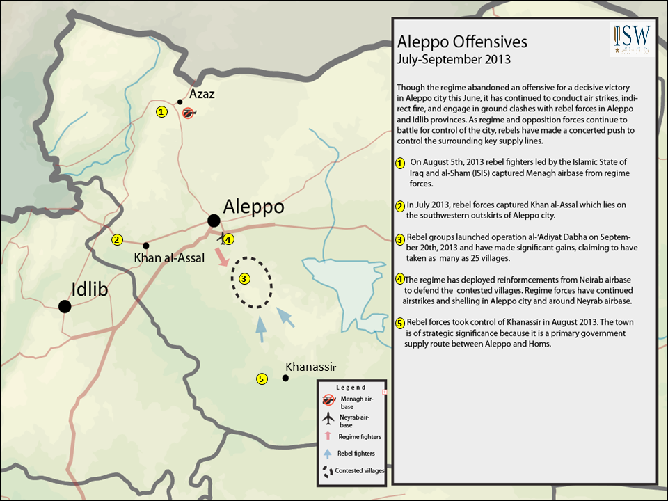 A group of rebel brigades, led by Ahrar al-Sham and Liwa al-Tawheed, have launched an offensive called wal-‘Adiyat Dabha against regime-held towns south of Aleppo city. The offensive comes after several rebel gains in Aleppo over the last two months. Of the brigades involved, five are signatories to the recent Islamic alliance announced by the leader of Liwa al-Tawhid on September 24th.