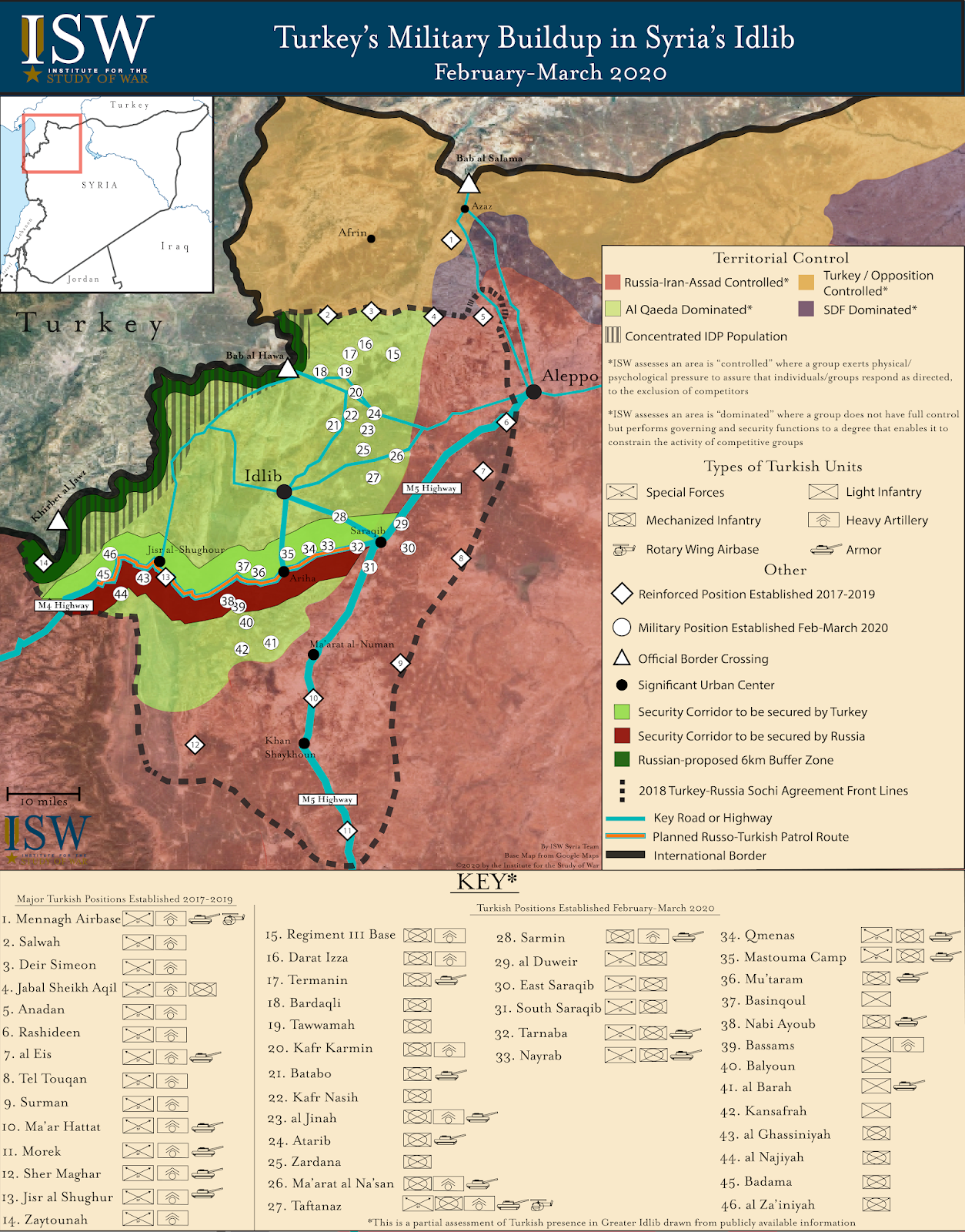 Note:According to the March 5 agreement between President Erdogan and President Putin, the M4 Highway security corridor would be controlled in the north by Turkey and in the south by Russia. A previous version of this map incorrectly depicted the southern part of the M4 Highway security corridor as “Russian controlled.” The updated version of this map accurately depicts this agreement but does not assess that Russia has control of the south and separately shows definitions of the terms “controlled” and “dominated” in the territorial control legend.