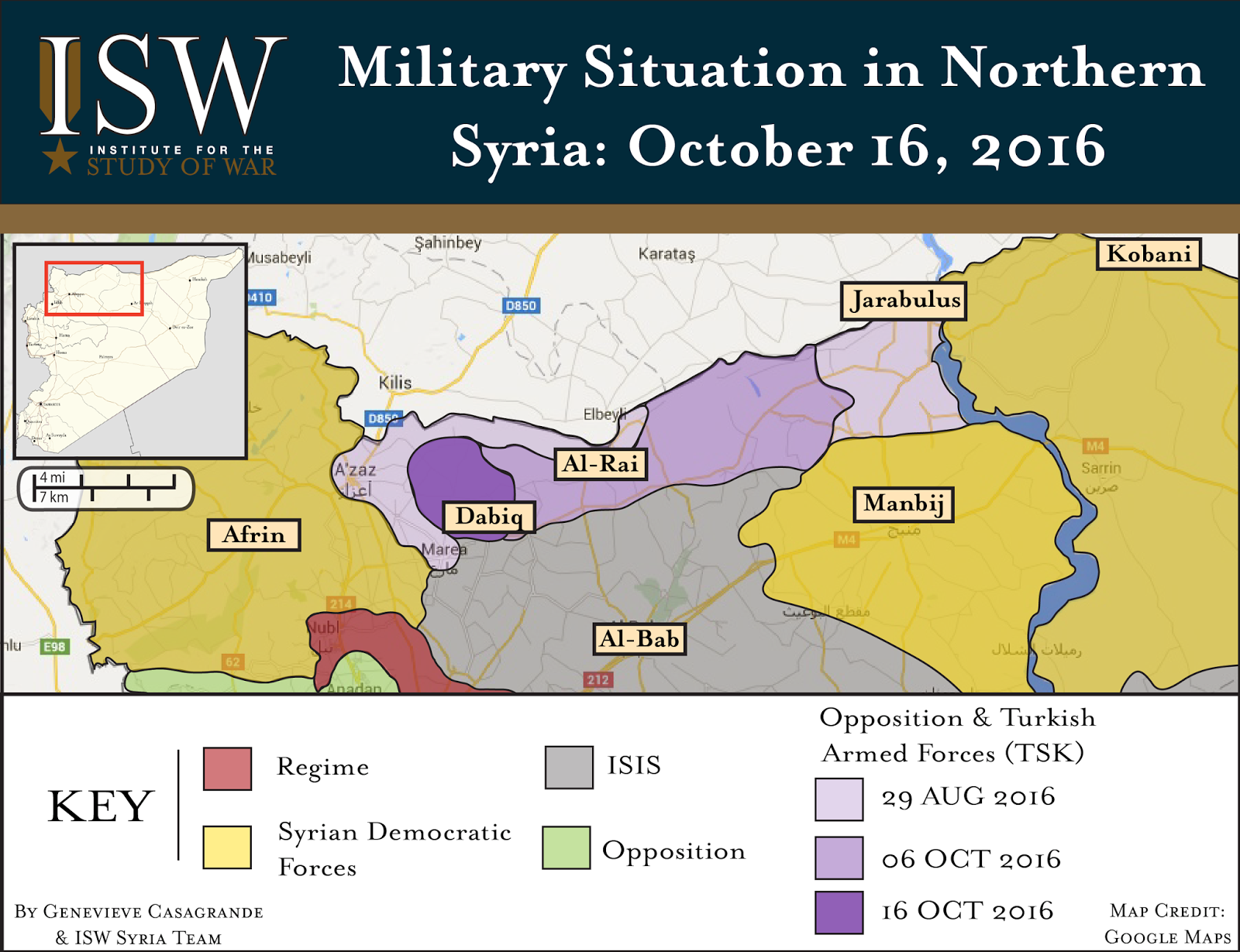 Turkey continues to position its allied opposition forces as powerbrokers in the fight against ISIS in order to counter Kurdish influence in northern Syria. Coalition-backed opposition forces seized the town of Dabiq from ISIS on October 16 as part of the Turkish-led operation Euphrates Shield. The recapture of Dabiq represents a symbolic loss for ISIS as the town holds symbolic significance for the jihadist group as the site of a future apocalyptic battle against the West. For Turkey, the recapture further solidifies its hold over the Syrian-Turkish border in northern Aleppo. Turkish President Recep Erdogan and Turkish-allied opposition factions have expressed their intent to next push south to seize the ISIS-held town of Al Bab, likely to preempt the predominantly Kurdish U.S.-backed Syrian Democratic Forces (SDF) from establishing a contiguous zone of control connecting the Afrin and Kobani Cantons in northern Aleppo Province. Turkish-backed opposition forces are particularly susceptible to penetration by al Qaeda, however, and their success against ISIS can undermine U.S. objectives in Syria over the long term.
