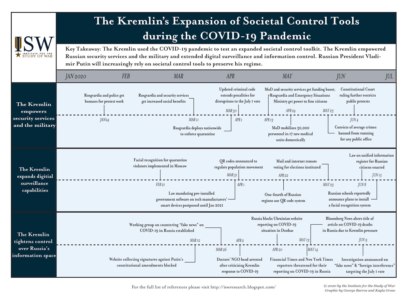 Key Takeaway: The Kremlin is using the COVID-19 pandemic to test an expanded societal control toolkit. The Kremlin has empowered Russian security services, deployed Russia’s national guard nationally, empowered the Ministry of Defense as a domestic actor for the first time, implemented mass digital surveillance, and further tightened control over Russia’s information space. The Kremlin seeks to expand its ability to control the Russian population in the long term, as Russian President Vladimir Putin increasingly relies on authoritarian measures to preserve his regime and suppress potential unrest in the aftermath of the national voting on Russia’s constitutional amendments on July 1. Digital surveillance technology, such as facial recognition, geolocation on smart devices, and comprehensive digital databases for all Russian citizens, will enable the Kremlin to circumvent the cost requirements associated with constructing and staffing a massive control infrastructure. These technologies will further erode privacy in Russia and grant the Kremlin new capabilities to discreetly identify and neutralize its opponents with minimal public confrontation. Putin will increasingly rely on societal control tools and digitally targeted repression to stifle critics and preserve his regime.