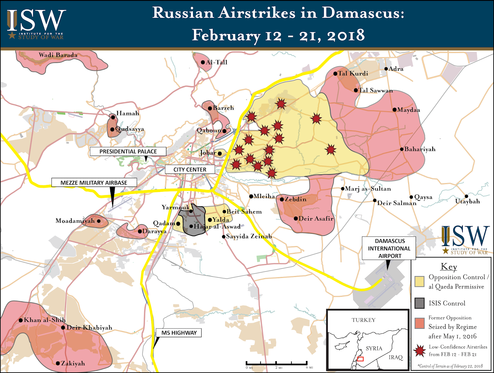 Russia is directly participating through its air campaign in an emergent humanitarian catastrophe in Eastern Ghouta. Russia and Syria dramatically intensified their airstrikes and artillery shelling on the besieged opposition-held Eastern Ghouta Suburbs of Damascus, killing more than four hundred civilians and targeting at least five hospitals on February 18 – 22. Kremlin Spokesperson Dmitry Peskov denied that Russia or its allies in Iran and Syria are responsible for the violence, stressing that all three states are engaged in an “absolute war against terrorism” in Syria. Russian Ambassador to the UN Vasily Nebenzia also accused global media of spreading “disinformation” regarding the situation in Damascus. ISW nonetheless confirmed airstrikes in nearly every opposition-held district of Eastern Ghouta by Russia on February 19 – 21. Russia also reportedly delivered large quantities of aerial munitions to the Syrian Arab Air Force at the Dumayr and Sayqal airbases outside Damascus on February 20. Russia remains culpable for the current humanitarian suffering in Eastern Ghouta.