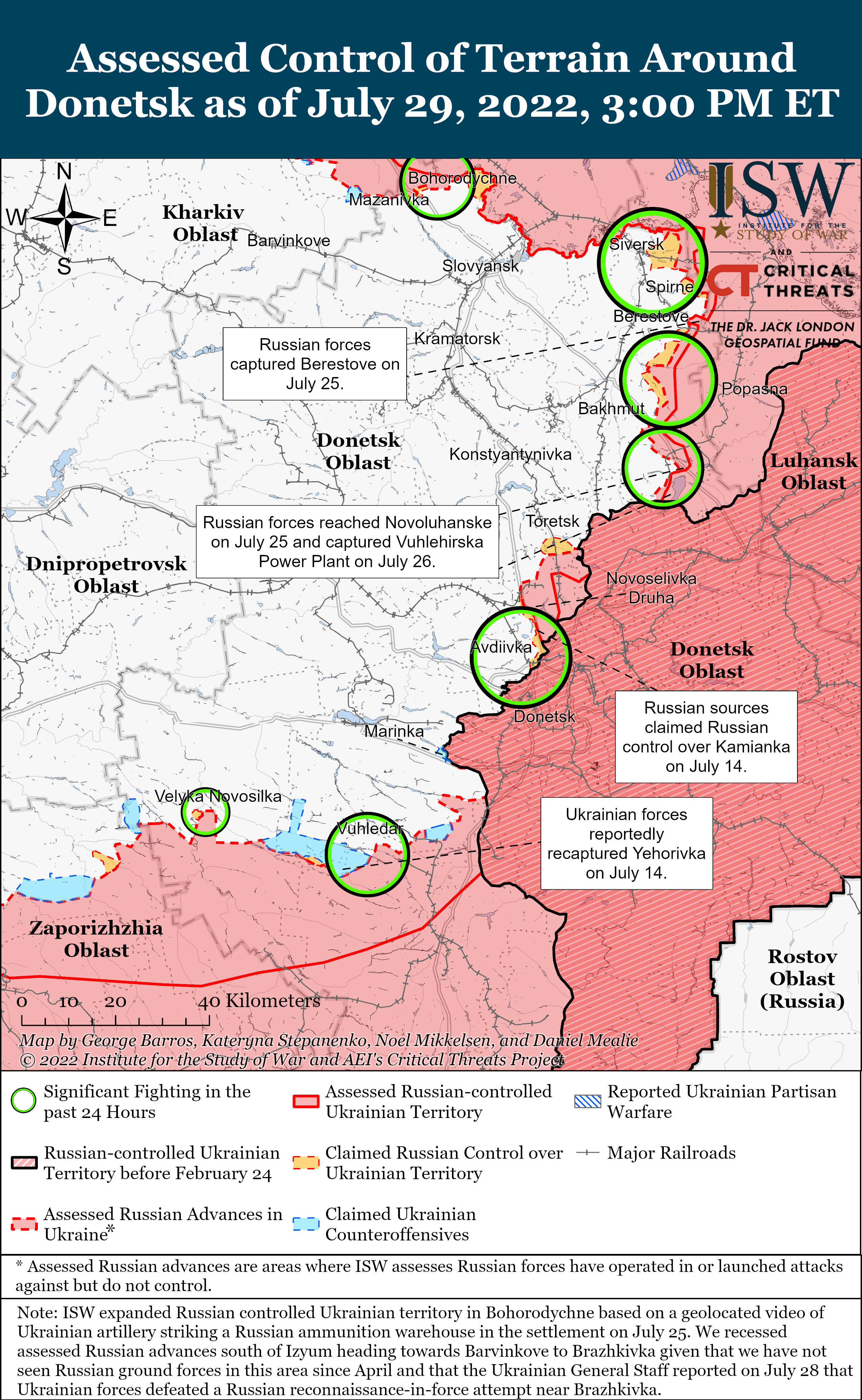 Russian forces escalated ground attacks on the northwestern outskirts of Donetsk City on July 29. The Ukrainian General Staff reported that Russian forces conducted ground assaults near Avdiivka, Kamyanka, Krasnohorivka, Vodyane, and Pisky, all north and northwest of Donetsk City.[20] The Donetsk People’s Republic (DNR) militia claimed that Russian and DNR forces in the Avdiivka area have made unspecified but significant advances north and east of the settlement.[21] Russian forces additionally maintained constant artillery pressure along the Avdiivka-Donetsk City line of contact.[22] Russian forces are likely re-engaging in offensive operations around Avdiivka to expand the defensive pocket around the northwestern sector of Donetsk City, as ISW assessed on July 28.[23]