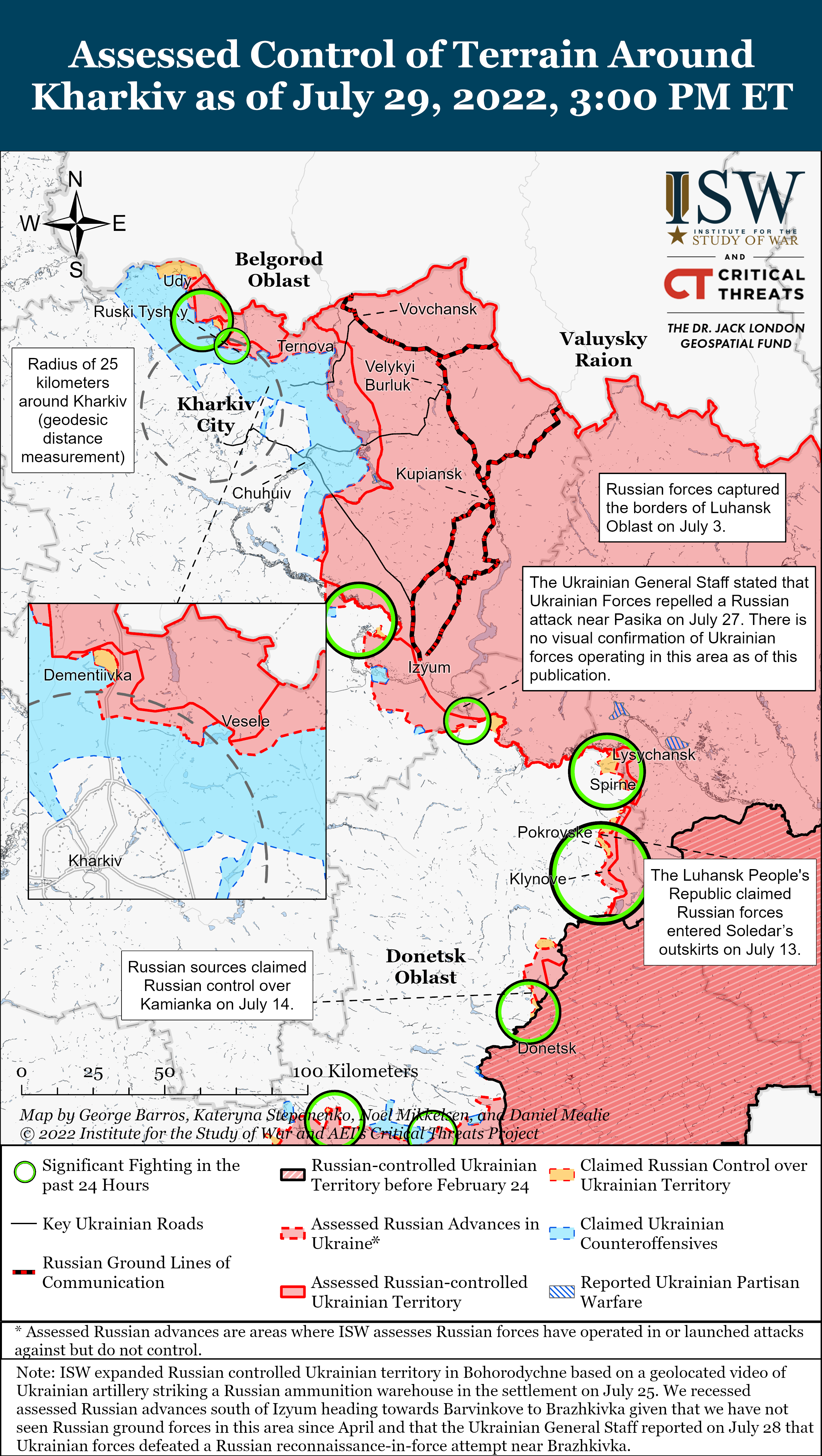 Russian forces conducted a limited reconnaissance operation northwest of the Izyum-Slovyansk line and otherwise continued to shell settlements to the northwest of Slovyansk on July 29. The Ukrainian General Staff reported that Ukrainian troops discovered and neutralized a Russian reconnaissance group in Shchurivka, 35km northwest of Izyum.[10] Shchurivka lies on the western bank of the Siverskyi Donets River, which suggests that Russian forces either attempted to cross or successfully crossed into Ukrainian-held territory in this area. Russian forces had conducted a reconnaissance operation in the Chepil area, just southwest of Shchurivka, on July 27.[11] Taken together, these two data points may indicate that Russian forces are setting conditions to advance further into Kharkiv Oblast northwest of the current Izyum-Slovyansk line, although the likelihood of Russian forces successfully taking additional ground in Kharkiv Oblast remains limited.[12]