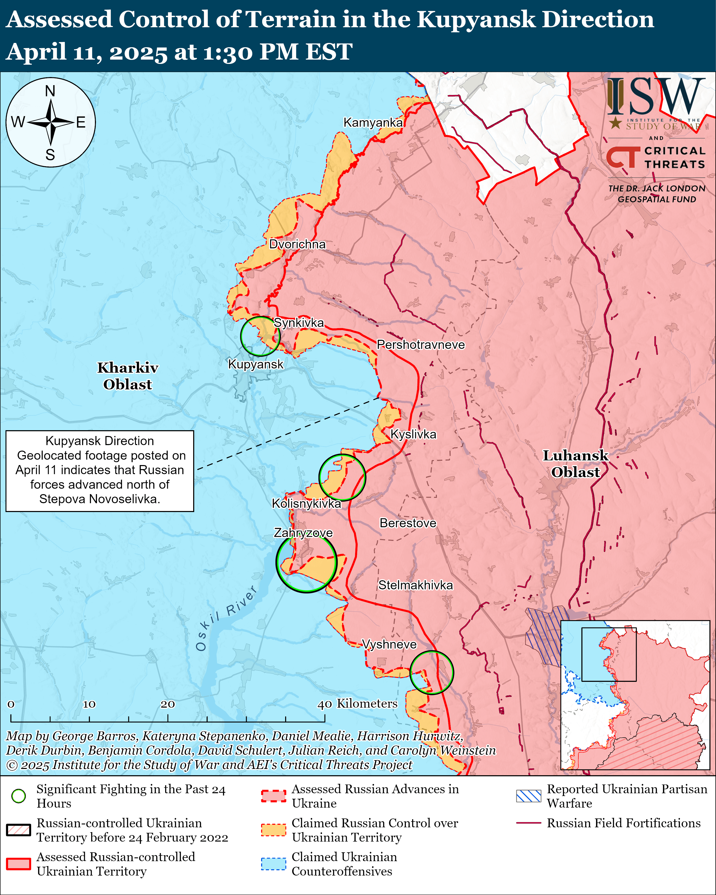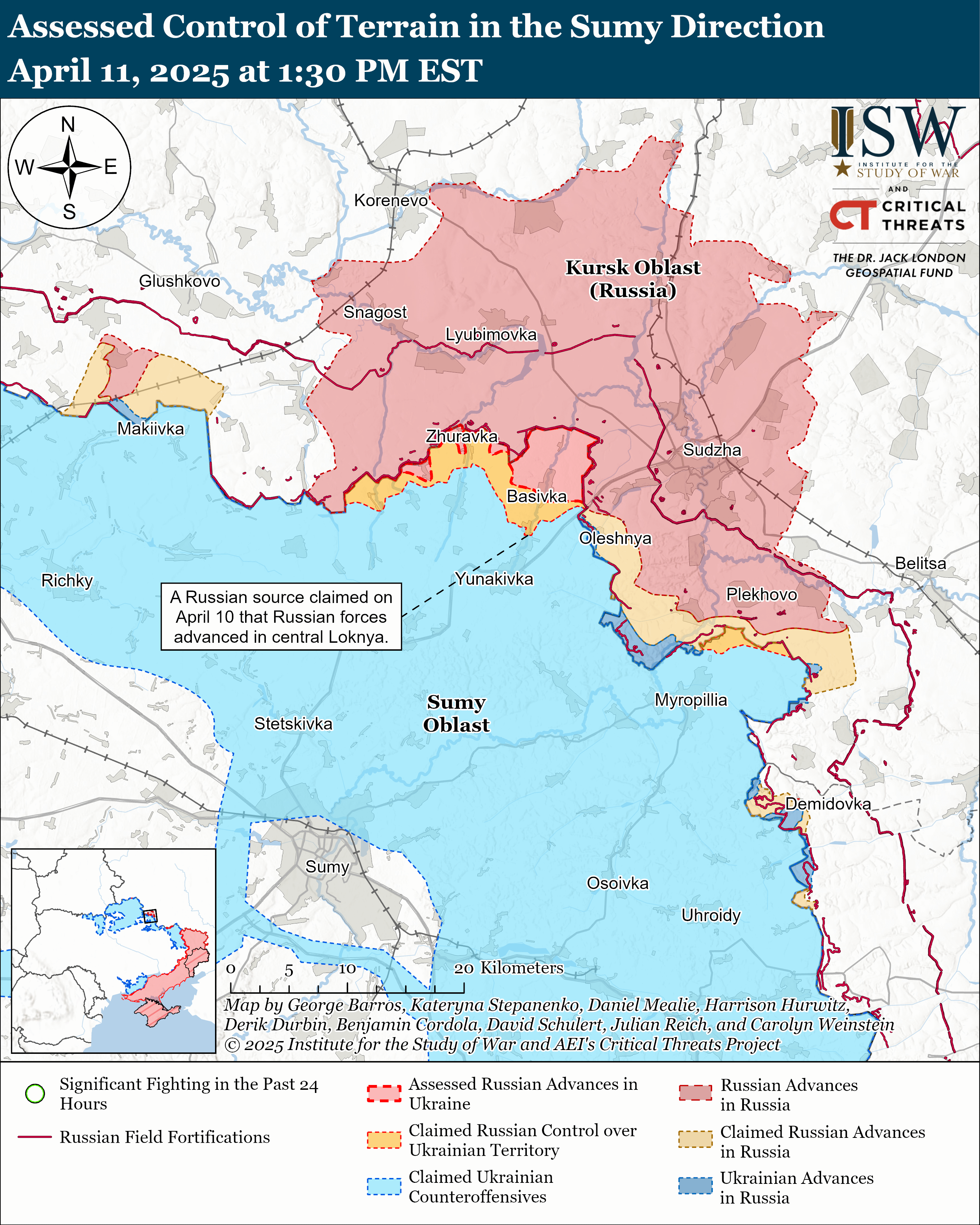 Ukrainian sources continue to speculate about which directions Russian forces will prioritize in Spring and Summer 2025. ISW is updating the axis sections in its Russian Offensive Campaign Assessment to reflect shifting Russian operational efforts along the frontline. Ukrainian Presidential Office Deputy Head Pavlo Palisa told Reuters on April 10 that Russian forces will likely intensify offensive operations in Ukraine in April and May 2025 and that Russia will continue to prioritize offensive operations in the Pokrovsk direction in coming months.[17] Palisa noted that Russian forces could also attempt to advance near Kupyansk, Lyman, or Novopavlivka in eastern Ukraine or towards Zaporizhzia City in southern Ukraine but reiterated that he assesses that the Pokrovsk direction will be Russia’s “absolute priority.” A source in the Ukrainian General Staff told BBC’s Ukraine Service on April 11 that Russian forces intend to create a buffer zone in northern Sumy Oblast and threaten Sumy City in the coming months.[18]