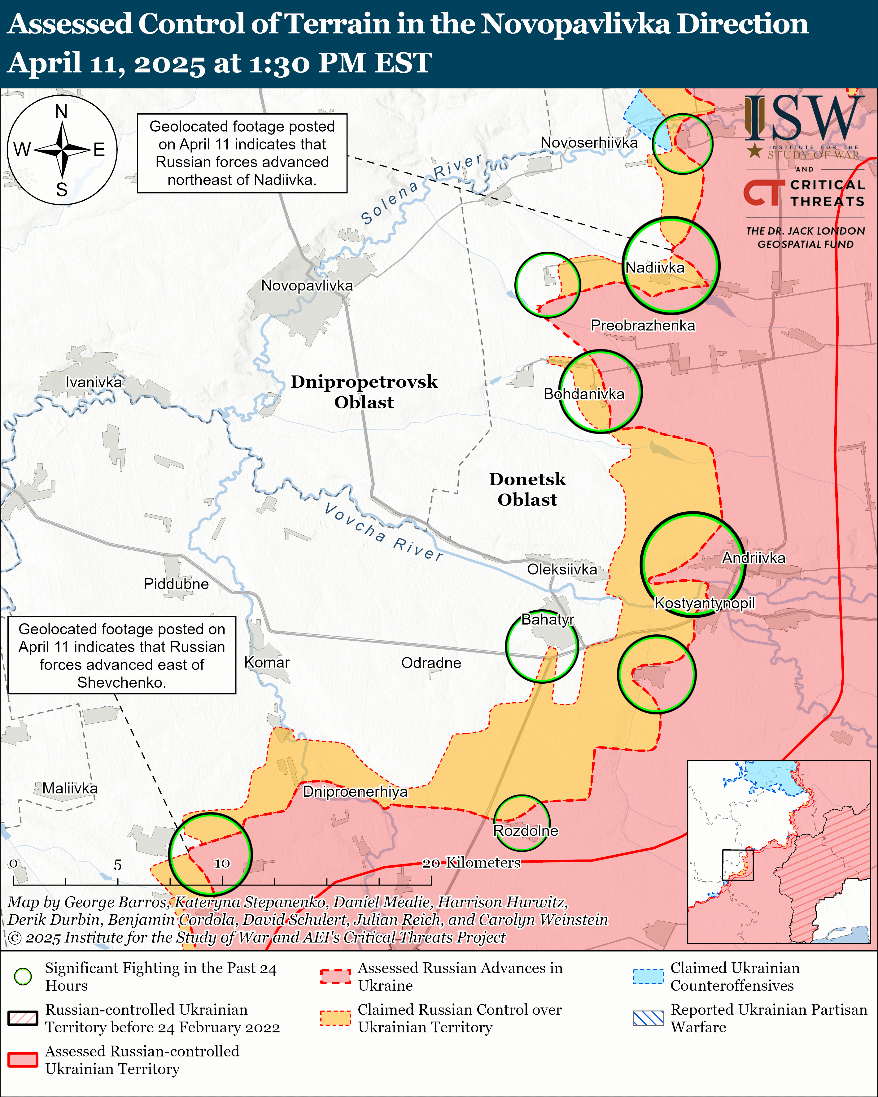 Assessed Russian advances: Geolocated footage published on April 11 indicates that Russian forces recently advanced northeast of Nadiivka (east of Novopavlivka).[63]