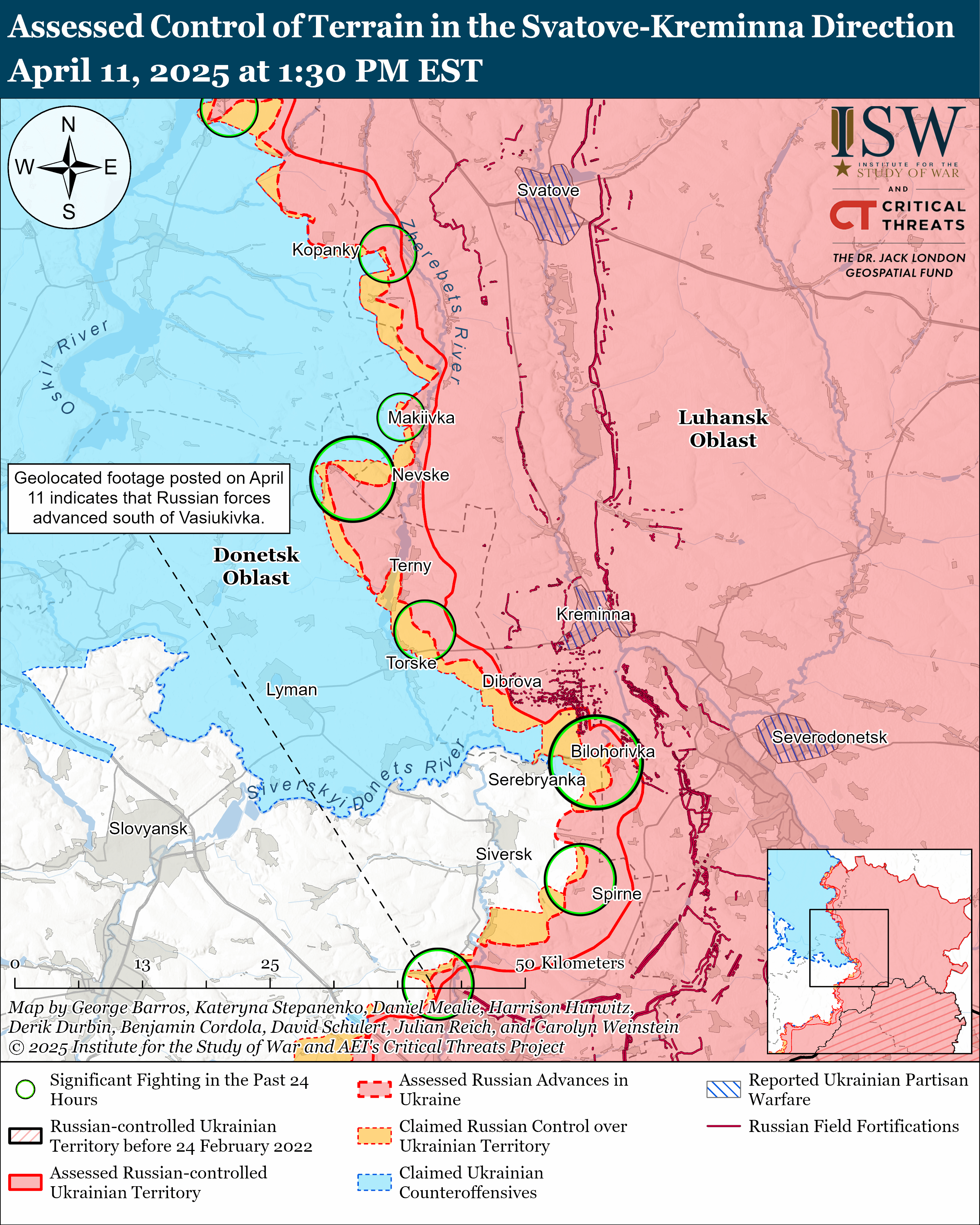 Confirmed Russian advances: Geolocated footage published on April 11 indicates that Russian forces recently advanced south of Vasyukivka (southwest of Siversk).[51]