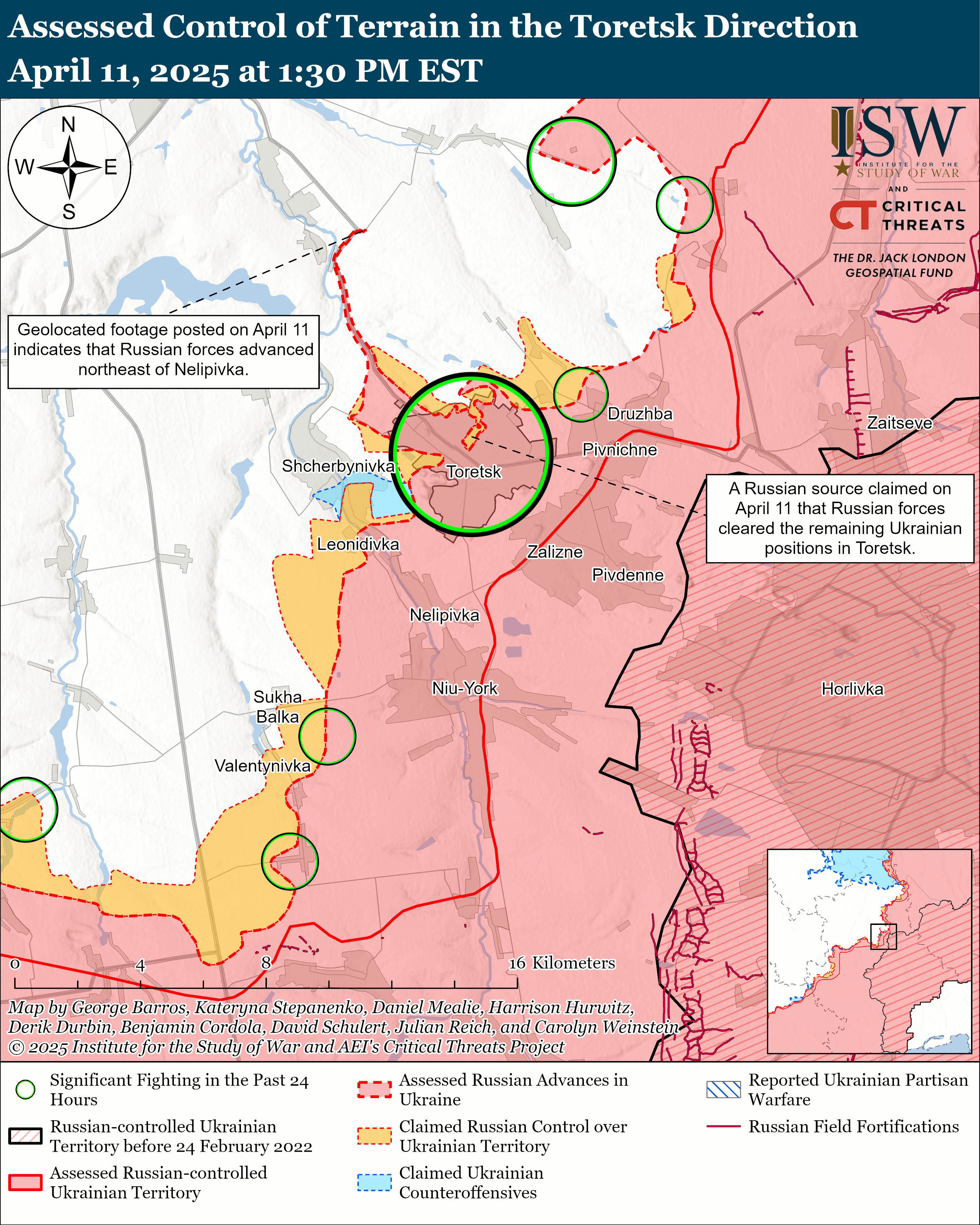 Assessed Russian advances: Geolocated footage published on April 11 indicates that Russian forces recently advanced northeast of Nelipivka (northwest of Toretsk) during a recent assault along the T-0516 Toretsk-Kostyantynivka highway.[57] It is unclear if Russian forces maintain enduring positions along the highway, given that the footage shows Ukrainian forces striking the Russian vehicles involved in the assault. ISW assesses that Russian forces advanced near Nelipivka as part of a Russian push that reached anomalously far ahead of the main Russian line, not that Russian forces maintain a sustained presence in the area. ISW defines a Russian advance as territory where Russian forces have operated in or launched attacks from, but over which Russian forces do not exercise control. ISW will refine the Russian salient northwest of Toretsk as additional information becomes available.