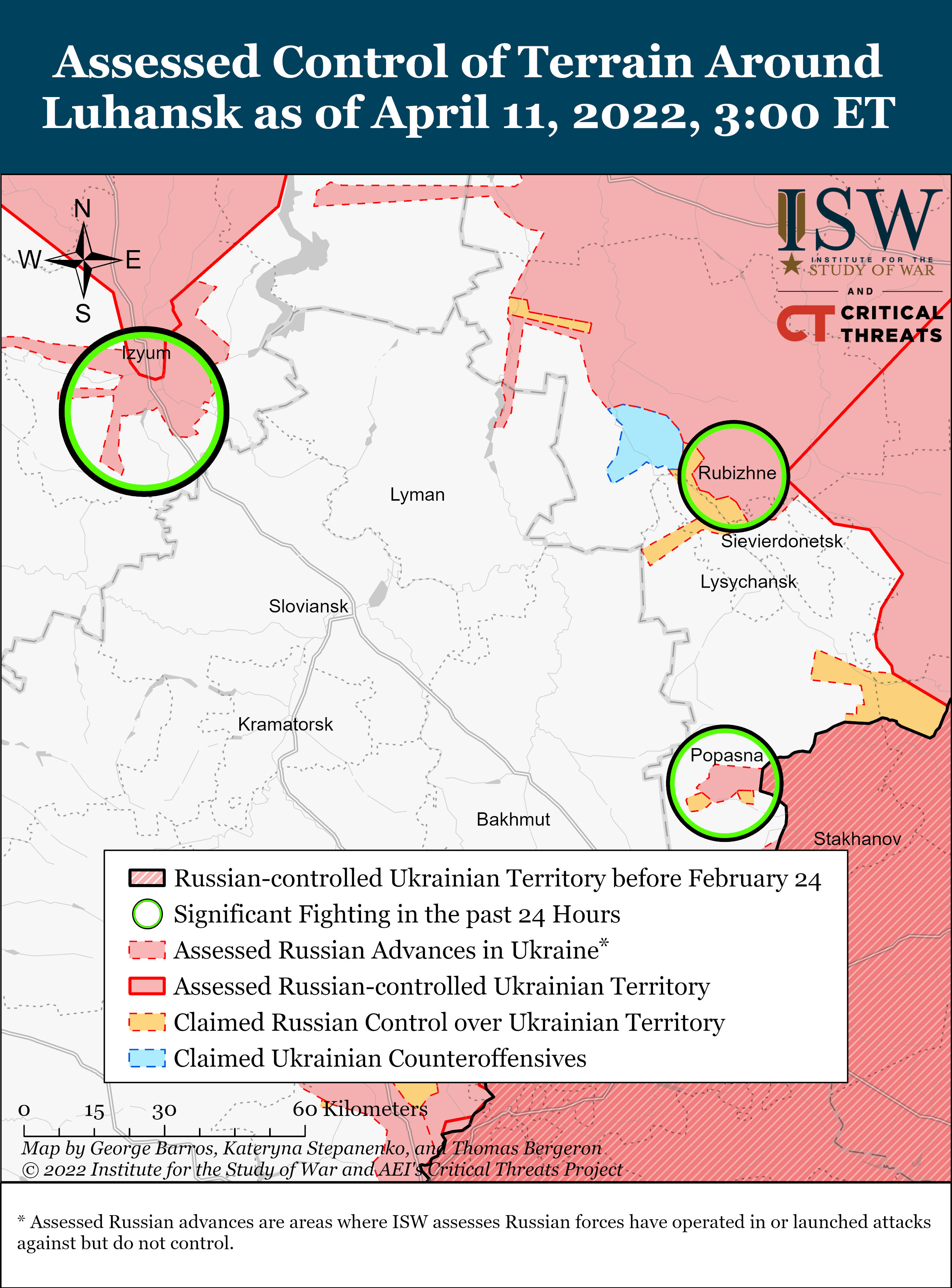 Russian forces failed to make significant advances in continued assaults on Severodonetsk, Popasna, and Rubizhne on April 11.[22] The Ukrainian General Staff stated Ukrainian forces repulsed four Russian attacks in Donetsk and Luhansk Oblasts and claimed Ukrainian forces destroyed a battalion tactical group (BTG) of the 70th Motorized Rifle Regiment, killing the battalion commander and his Chief of Staff.[23] The Russian 60th Separate Motorized Infantry Brigade of the 5th Combined Arms Army is likely preparing to deploy into Donbas.[24] Russian forces continue to redeploy from northeastern Ukraine to support operations in Donbas, and social media users filmed a large column of Russian military equipment reportedly withdrawn from the Kyiv axis moving west toward Donetsk in Matveev Kurgan, Rostov Oblast on April 11.[25]
