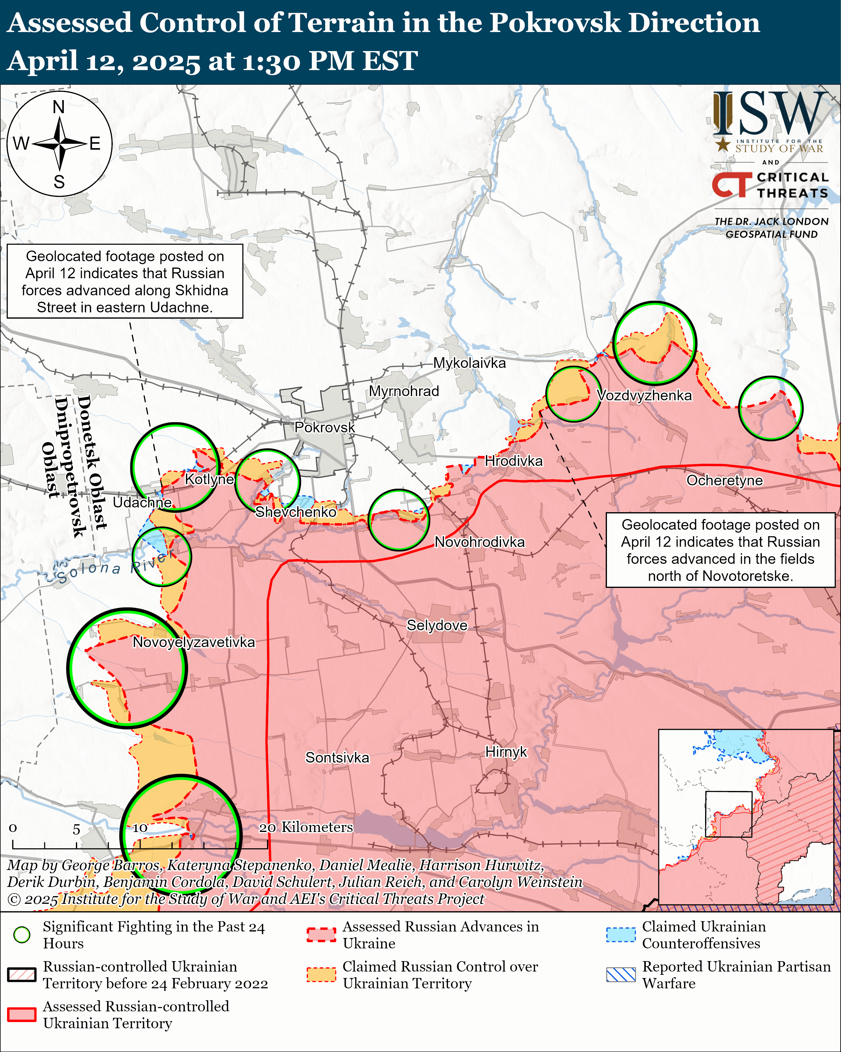 Russian forces continued offensive operations northeast of Pokrovsk near Kalynove and Tarasivka, east of Pokrovsk near Yelyzavetivka, southeast of Pokrovsk near Lysivka, south of Pokrovsk near Pishchane, and southwest of Pokrovsk near Kotlyne and Udachne on April 11 and 12.[56] A Russian milblogger claimed that Ukrainian forces periodically counterattack south and immediately southwest of Pokrovsk.[57]